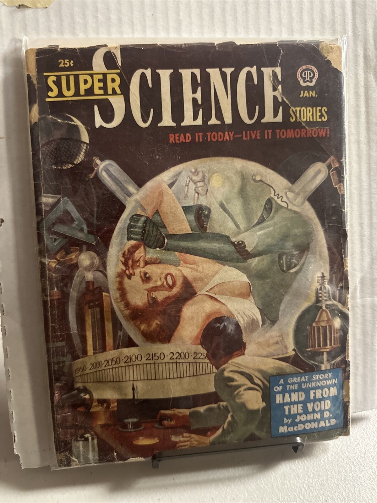 This issue of Super Science Stories Pulp, published by Popular Publications in January 1951, is a must-have for collectors of comic books and memorabilia. With a volume of 7 and issue number 4, this magazine features science fiction stories that will surely captivate readers who love the genre.The magazine is written in English and has a publication name of Super Science Stories Pulp. It is categorized under "Collectibles" and "Magazines" in Hip's online marketplace. This particular issue has a grade of GD 2.0, making it a low-grade item, but this does not detract from its value and uniqueness. The magazine is perfect for fans of science fiction and individuals who appreciate vintage collectibles.