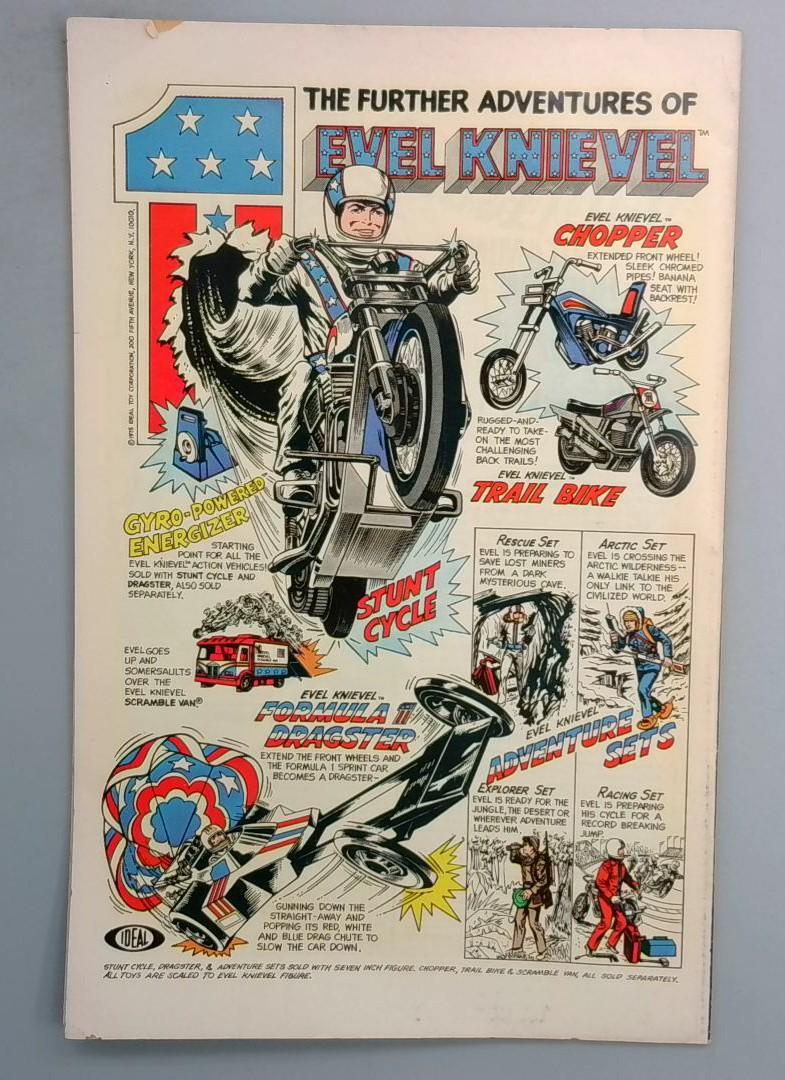 THE FURTHER ADVENTURES OF EVEL KNIEVEL - A promotional insert or bonus feature advertising Evel Knievel action vehicles and adventure sets. The page highlights multiple themed playsets including the Chopper with gyro-powered energizer, Stunt Cycle, Formula I Dragster, and various Adventure Sets themed around rescue, arctic, explorer, and racing scenarios. Each vehicle came with a seven-inch Evel Knievel figure and detailed accessories.