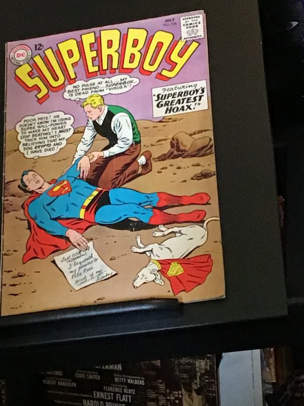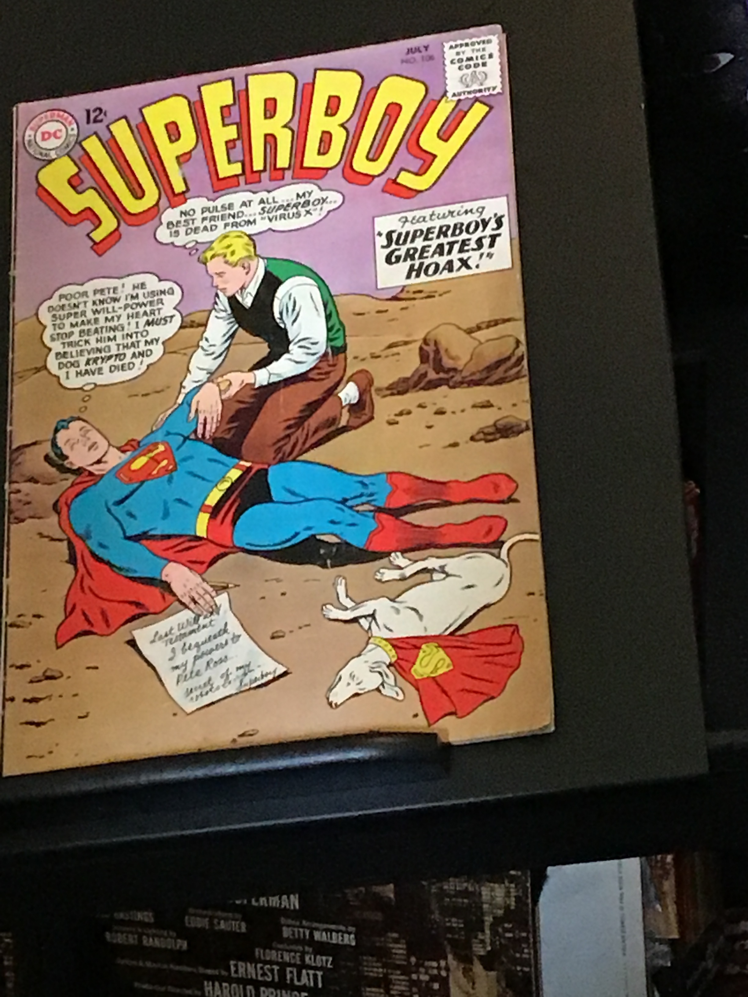 Superboy #106 (1963) This book has deep rich colors are nice I appeal on this all time classic hoax cover. With light creasing at the lower outer end of the front cover and I think tip up left at the lower end of the back cover with cream interiors. We have adjusted the grade accordingly.Seller Information