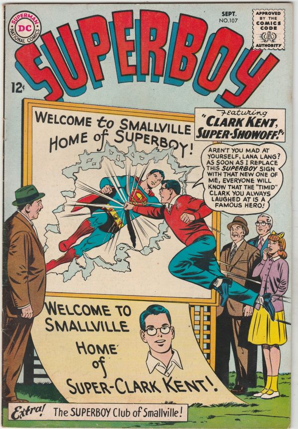 Superboy #107 - "Clark-Kent Super-Showoff!" APPEARANCE - Lana Lang! CAMEO - Lex Luthor Wow! This book has a very sharp rich all-time-classic Lana Lang and Clark Kent cover! There is very light rust spotting around ... Read More