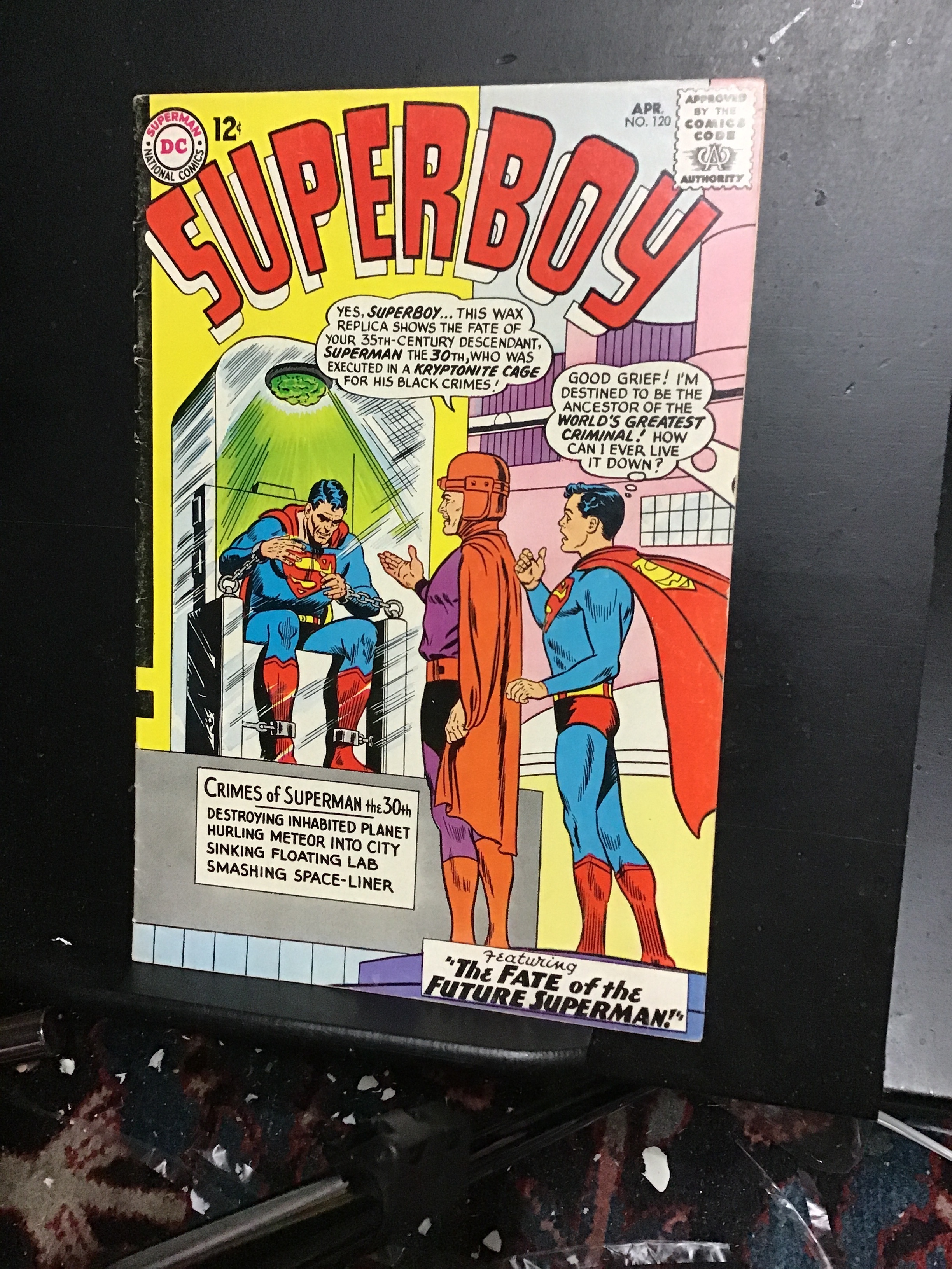 Superboy #120 (1965) This book has deep rich color and nice eye-appeal on this all time classic Superboy meets 30th century Superman cover! With cream pages and inside covers. The book is well attached at the spine and centerfold. We have adjusted the grade accordingly for The page quality and stressors along the front spine. With light wear appropriate grade. Note: any shadows or glare on the cover is due from the photograph and not on the book itself unless dulally noted. This book comes with a certificate of authenticity from our one owner high-grade Boca collection!Seller Information