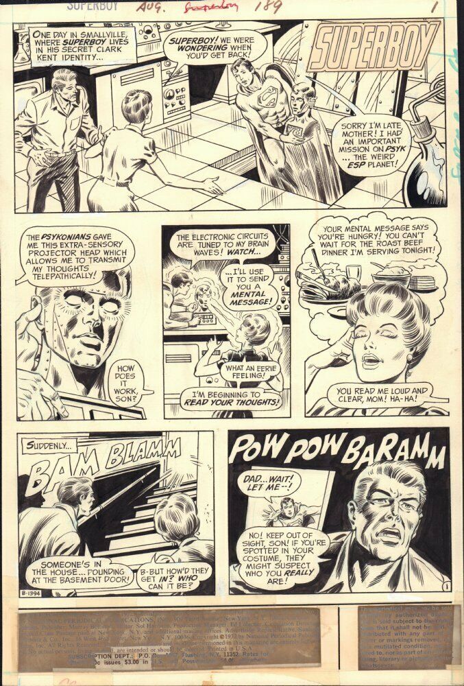 Superboy #189 p.1 - Superboy with Robot Head - 1972 art by Bob Brown and Murphy AndersonSize: 10.5" x 16"This item was uploaded by Bobby.If you have any specific questions or requests, please ask us prior to ordering and we'll get back to you as soon as we can. If there are any problems with your order whatsoever, please message us before leaving feedback and we'll be happy to work with you to fix the situation!We ship worldwide, combine purchases, and charge exact shipping. The price may vary based on size, weight, and location. If you are automatically overcharged for shipping, message us and we'll be happy to revise the invoice or refund you the excess amount. If you have any questions regarding shipping, please message us.International Buyers - Please Note: Import duties, taxes, and charges are not included in the item price or shipping cost. These charges are the buyer's responsibility. Please check with your country's customs office to determine what these additional costs will be prior to bidding or buying. Payment can be made by PayPal and credit cards directly. 120,000+ items in total in my Hip store! Frequently Asked Questions: When are your operation hours?Our in office hours are Monday - Friday, 11 am - 8 pm. We are not open on weekends, so if you send us a request on Friday evening we won't get back to you until Monday afternoon. Please don't take it as us ignoring you! We will work on your request Monday and get back to you as soon as we can. Also, if you order from us on a Friday evening or Saturday morning we won't start processing your order until we open on Monday. That means on Monday it will be pulled and prepped for shipping, then picked up by the postman on Tuesday morning.When will you ship my item? The tracking hasn't moved.We realize you're eager to get your item, so if the tracking hasn't moved in a few days please don't be concerned. We give the postman a lot of packages daily, sometimes as many as 100, so he does not scan each item for us upon pickup as he says it would be too time consuming for him to do so. If you get a tracking number from us, that almost always means your item was picked up by the postman the next business day. The USPS is also imperfect. There are times when the tracking won't even show movement until it's in your area's regional distribution center. This is normal in our experience. Is this original artwork? Yes! I am a professional comic book art dealer with 20+ years experience. The image pictured is one of a kind original artwork unless otherwise described. Can you issue a COA? We can, upon request. Please make sure you leave us a note while checking out and shoot us a message immediately after requesting one, just to be sure. What is your base shipping for art? $10 for Domestic, International varies depending on location. Please use Hip's shipping calculator for specifics. How do you ship comics?We ship in rigid cardboard mailers to protect your comic book from the worst the mail system has to offer. Price varies based on the number of books you purchase, but we try to keep costs as low as we can and charge exact shipping. If it looks unusually high to you please send us a message and we'll be happy to double check for you. What is your base shipping for CGC comics? Domestic for CGCs are $10 for the first and $5 for each additional one you add. Do you combine shipping? Yes, of like items. Such as: several comics can fit in one cardboard mailer, as can more than one record. Multiple art pages can easily be combined because they are light and thin. Where combined shipping differs is with size and weight. For instance, two statues require a much bigger box. Same goes for CGCs, as the package gets bigger and heavier as you go. Do you ship well? I've had some bad experiences... You needn't worry; we are professionals who value your business and want your item to arrive safely as much as you do. I have been collecting for over 30 years. I send out items the way I would like to receive them. The tracking says my item is "OUT FOR DELIVERY" in New Jersey. Why is that?If the tracking indicates that the item is "OUT FOR DELIVERY" in NJ don't worry, it's just what the tracking says when it's carried over from the postman to the sorting center. This is normal for our Post Office and will not impact you receiving your item in a timely matter.Have these CGCs had any previous owners? No. I have personally sent in almost all of these to CGC and had them returned to me, offering them fresh to the market for the 1st time. I changed my mind after successfully winning the auction or fixed price listing, will you cancel the transaction? Please only bid or hit BUY IT NOW if you are willing to follow through and pay for the item, we will not cancel the transaction. As a seller, Hip penalizes us every time we cancel an order, so it is detrimental to our business to do so. Therefore if you will not pay, then you'll have to let Hip cycle this to an "unpaid item" and accept whatever action Hip deems necessary. 120,000+ items in total in my Hip store! MEET OUR STAFF: Pictured left to right, my employees: Bobby, Justin, Mario V., Connelly, Mario B., Alejandro, Sumie, and Anthony.AS SEEN ON TV : I have been buying and selling artwork and comics for about 20 years. If you are new to buying art or comics feel free to ask any questions that you may have. 120,000+ items in total in my Hip store! Small, Regular, and Large Portfolios available; see my Hip store!
