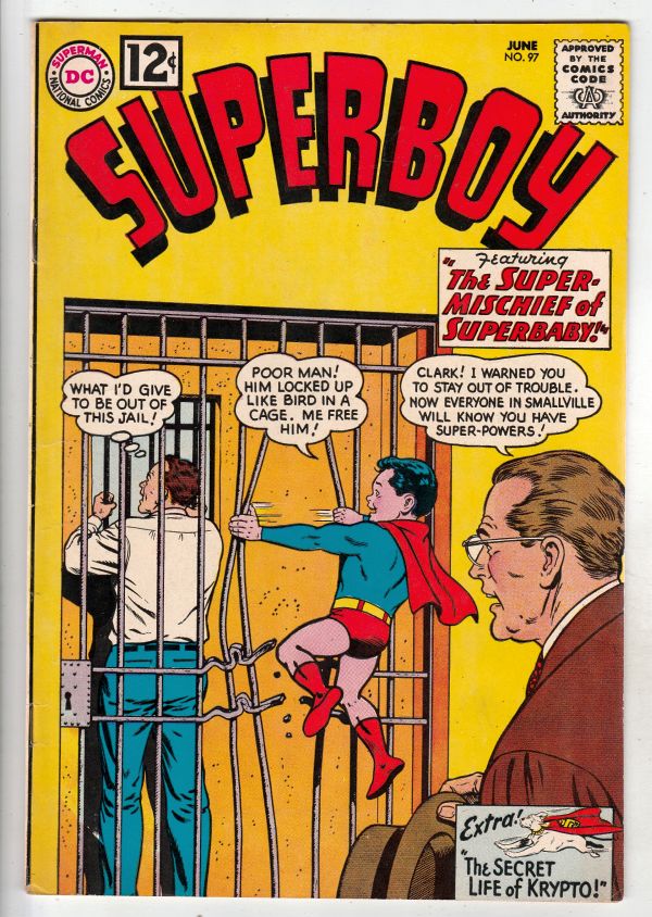 Superboy #97 - Featuring "The Super-Mischief of Superbaby!" APPEARANCE - Superbaby spanking scene. APPEARANCE - Krypto solo story. This book is from the newly found Richmond One-Owner Super-High-Grade collection a ... Read More