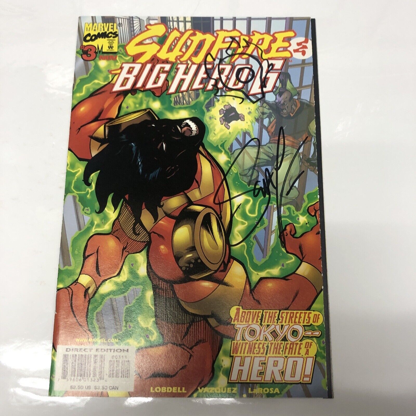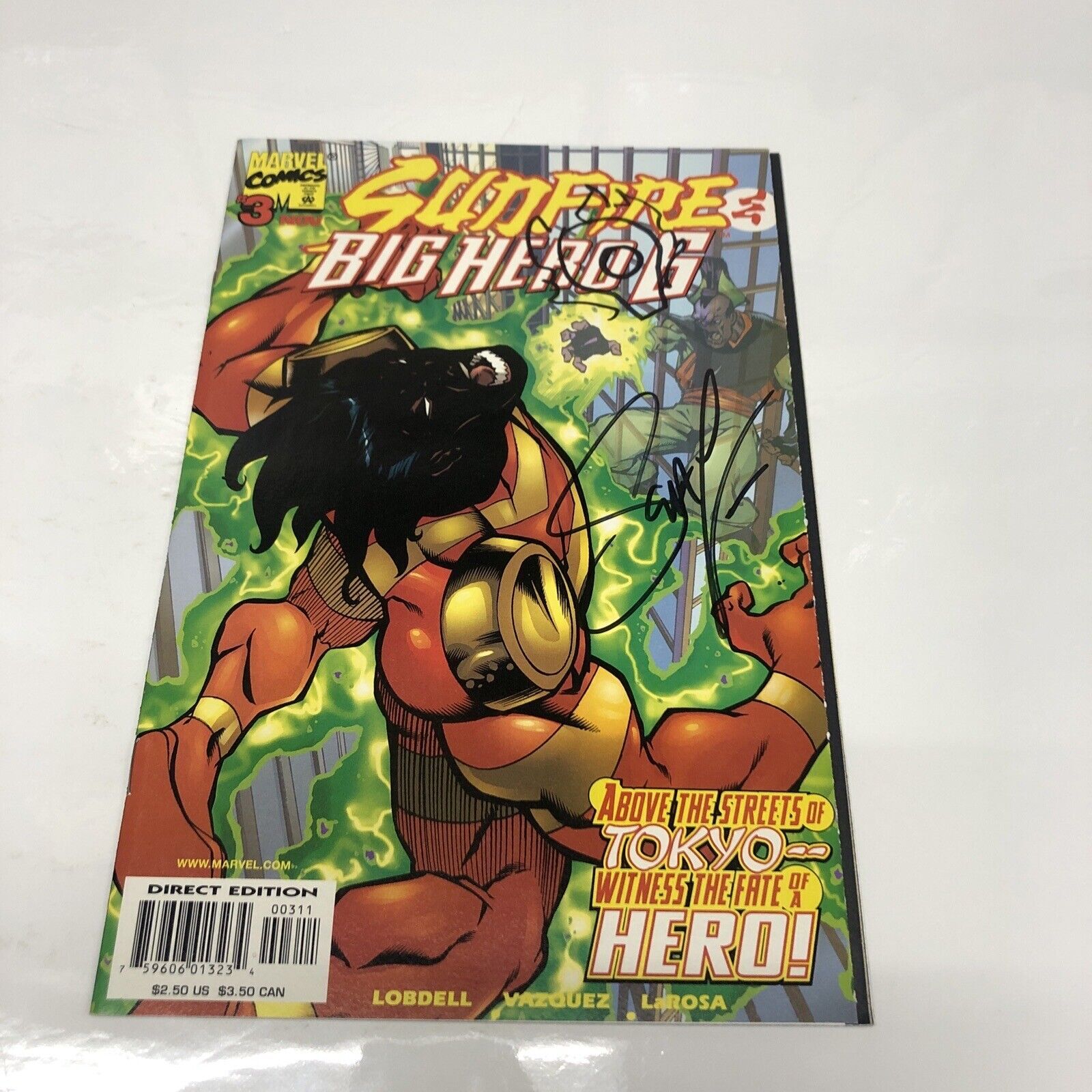 Grade: 7.0 Fine/Very FineGet your hands on a rare copy of Sunfire & Big Hero Six #3 from 1998, signed by writer Scott Lobdell! This action-packed comic is in 7.0 Fine/Very Fine condition and is a must-have for fans of Marvel Comics. The modern age (1992-now) story follows the adventures of Sunfire and the superhero team Big Hero Six, and is written in English.This collectible item is perfect for comic book enthusiasts and collectors alike. Add it to your collection today and enjoy the thrill of owning a piece of US comics history.