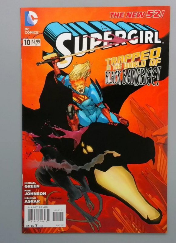 Supergirl #10 from DC Comics' New 52 line finds Supergirl trapped in the mysterious world of Black Banshee. The issue, written by Michael Green and Mike Johnson with art by Mahmud Asrar, explores a surreal and dangerous landscape that challenges Supergirl's powers and perception of reality. The dynamic cover depicts Supergirl in an intense action pose against a vivid orange and black background, highlighting the high-stakes narrative of this installment.