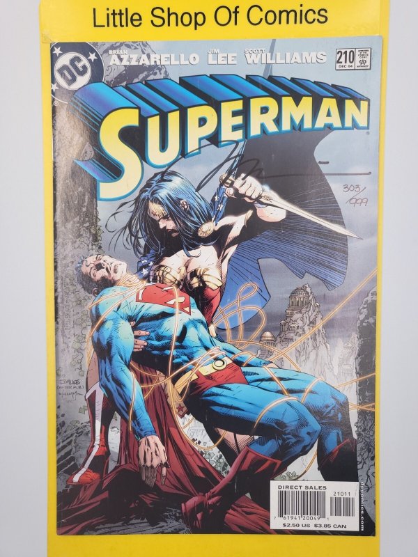This listing is for one (1) copy of Superman #210 Signed by Jim Lee Dynamic Forces w/COA #303/999 SPECIAL NOTE: color rubs/breaks, spine ticks, dings. ALL COMICS ARE BAGGED AND BOARDEDPLEASE READ Paypal users must be verified, with a Confirmed Shipping Address.We package comics in a T-FOLDER, we take the extra step to protect your comic by taping the book down in the T-folder to prevent movement.Local pick-up is on Thursdays from 11 am to 4 pm. Thank you for looking at our listing, this is how we make a living if you have any issues with your item(s) please get in touch with us first so we can help you with resolve that issue. Again, thank you for checking us out.Seller Information