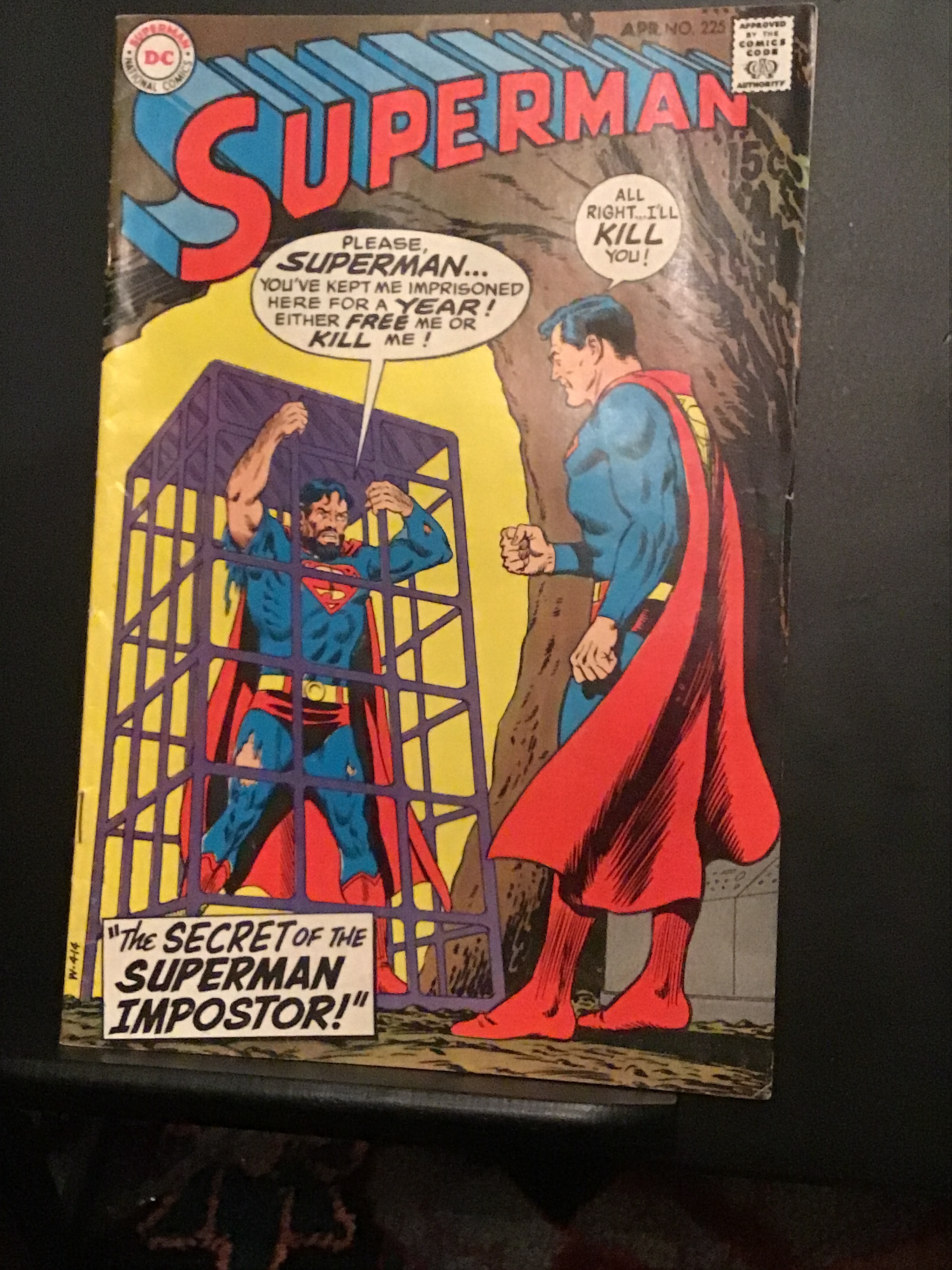 Superman #225 (1970) This book has nice rich color and decent eye-appeal on this all time classic caged Superman imposter cover! With light wear at the outer edge of the front cover and some stressors on the front spine. With light wear appropriate to grade. Cream pages and white inside covers! We have adjusted the grade accordingly.Seller Information