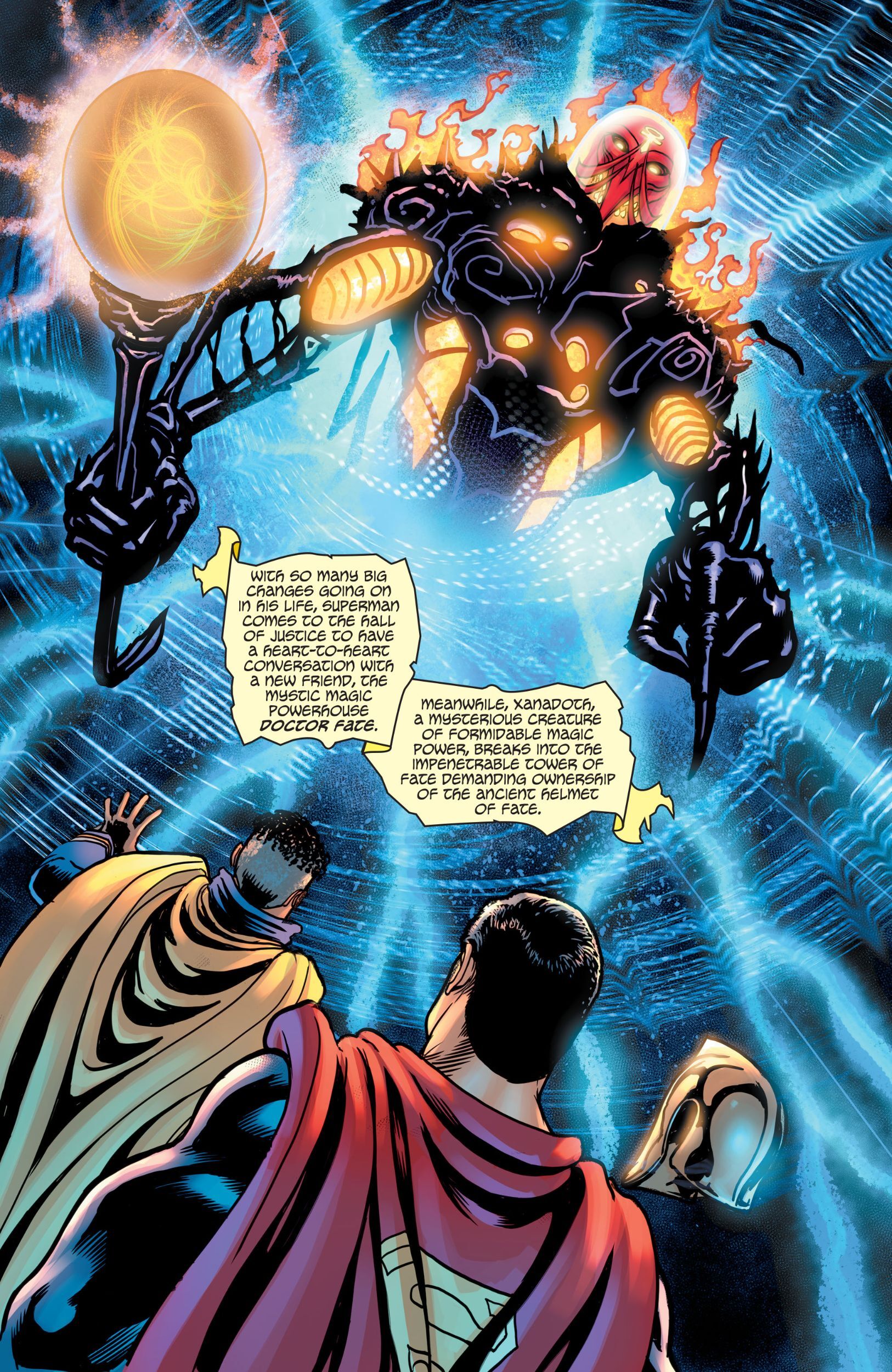 Superman’s legendary susceptibility to magic is about to turn his life inside out and upside down. A mysterious new villain has come into Superman’s world to pit him against the most powerful sorcerer and agent for the Lords of Order: Doctor Fate!