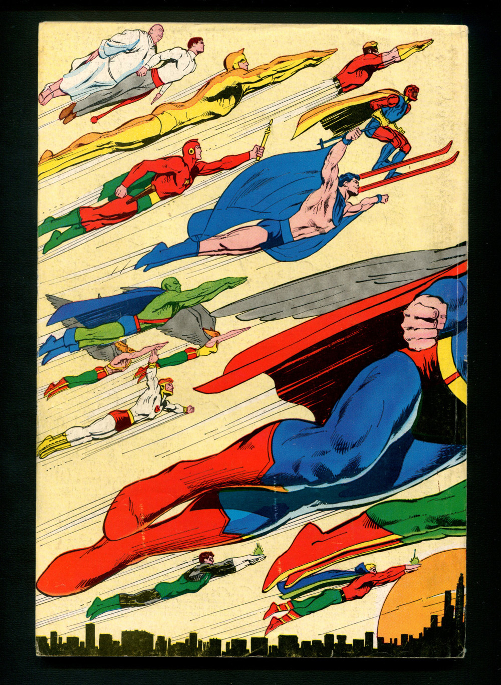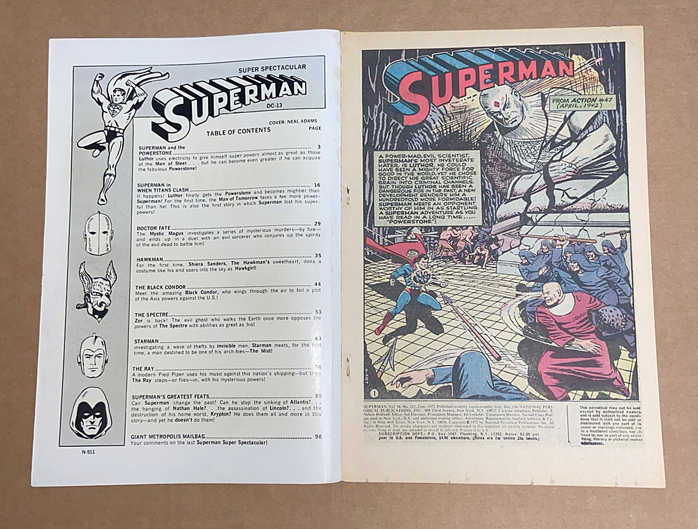 * A great Neal Adams wrap-around classic cover featuring 21 super heroes in dynamic flight gets this beautiful 100-page giant off to a soaring start (see inside back cover for cover key/diagram and cool info about each hero). The lead off story, "Powerstone!" is a Superman reprint from Action #47 (April, 1942) with none other than Luthor as Superman's challenger. Luthor pops up again and faces death in the electric char in "When Titans Clash!" from Superman #17 (July-Aug. 1942). Next up is a great Doctor Fate reprint from More Fun Comics #57 (July, 1940), with Howard Sherman art. Other Golden Age reprints include Hawkman from Flash Comics #24 (Dec. 1942) with art by Sheldon Moldoff; a great Black Condor story from Crack Comics #18 (Nov., 1941) with Lou Fine's top-notch art; a Spectre reprint illustrated by Bernard Baily; a Starman story, "The Menace of the Invisible Raiders!" from Adventure #67 (Oct., 1941) by Jack Burnley; another great Lou Fine illustrated story, this time the Ray from Smash Comics #17 (Dec., 1940); then Superman wraps up the issue in "Superman's Greatest Feats!" from Superman #146 (July, 1961) with art by Al Plastino. 100 Pages