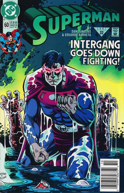 Item: Superman (2nd Series) #60 (Newsstand) | Publisher: DC | Cover Date: October 1991 | Writer: Dan Jurgens | Artist: Dan Jurgens | Cover Artist: Dan Jurgens | Appearances: Agent Liberty, Intergang, Mannheim | Storylines: Intergang — No More! | Notes: Newsstand edition; [s]1991-32; 1st appearance of Agent Liberty; Versus Intergang Continued in Adventures of Superman #483; Versus Intergang | With Economy shipping, each additional comic ships for just 50 cents more to customers in the USA. This listing contains a stock photo and information from ComicBase™ and © Human Computing. The stock photo is for reference only. If you would like to see a photo of the actual item, please message us prior to purchasing.Seller Information