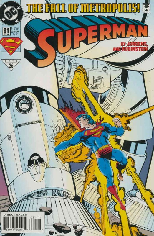 Item: Superman (2nd Series) #91 | Publisher: DC | Cover Date: July 1994 | Writer: Dan Jurgens | Artist: Brent Anderson | Cover Artist: Dan Jurgens | Appearances: Lex Luthor | Storylines: My Life! | Notes: [s]1993-26; The Fall of Metropolis! | With Economy shipping, each additional comic ships for just 50 cents more to customers in the USA. This listing contains a stock photo and information from ComicBase™ and © Human Computing. The stock photo is for reference only. If you would like to see a photo of the actual item, please message us prior to purchasing.Seller Information