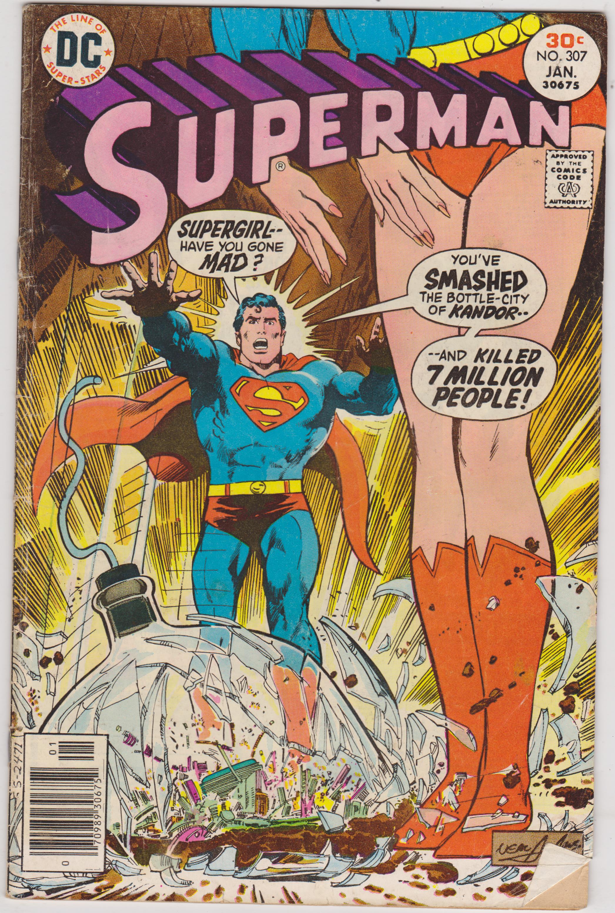 Superman #307 by DC Comics copyright 1979. I have graded the comic book, using the Overstreet Grading Guide, at FINE- with the following defects: Light stress marks along the spine. The corners are rounded. There are folds in the lower right corner. There is yellowing of the pages.Seller Information