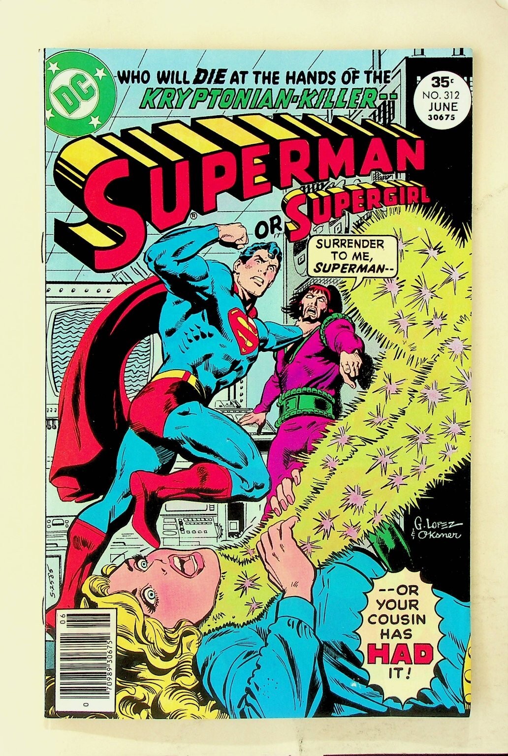 Grade: 7.5 Very Fine-This is a single issue of Superman #312 published by DC Comics in June 1977. The cover features Superman in action against a villain, with Supergirl's fate in question, under the banner "WHO WILL DIE AT THE HANDS OF THE KRYPTONIAN-KILLER?" The distinctive cover art is by G. Lopez and O'Konen. This comic book is a classic Bronze Age collectible, identified as a Newsstand Edition by its visible barcode. It is a key issue from an era known for its developing storytelling and iconic characters.This listing includes one (1) comic book. It is a highly sought-after item for collectors of DC Comics, Superman, and Bronze Age comic books. The issue features a compelling storyline involving a "Kryptonian-Killer" and the potential demise of Supergirl, making it a dramatic read for fans of the Man of Steel and the larger DC Universe. The back cover features a vintage Spalding Street Ball advertisement starring Julius Erving, further cementing its Bronze Age authenticity.Verified Specifications:Publisher: DCSeries Title: SupermanIssue Number: #312Item Type: Single IssueEra: Bronze AgeFormat: Newsstand EditionCover Type: Standard CoverKey Features: Kryptonian-Killer storylineIncluded Components: 1x Comic BookCountry of Origin: USA