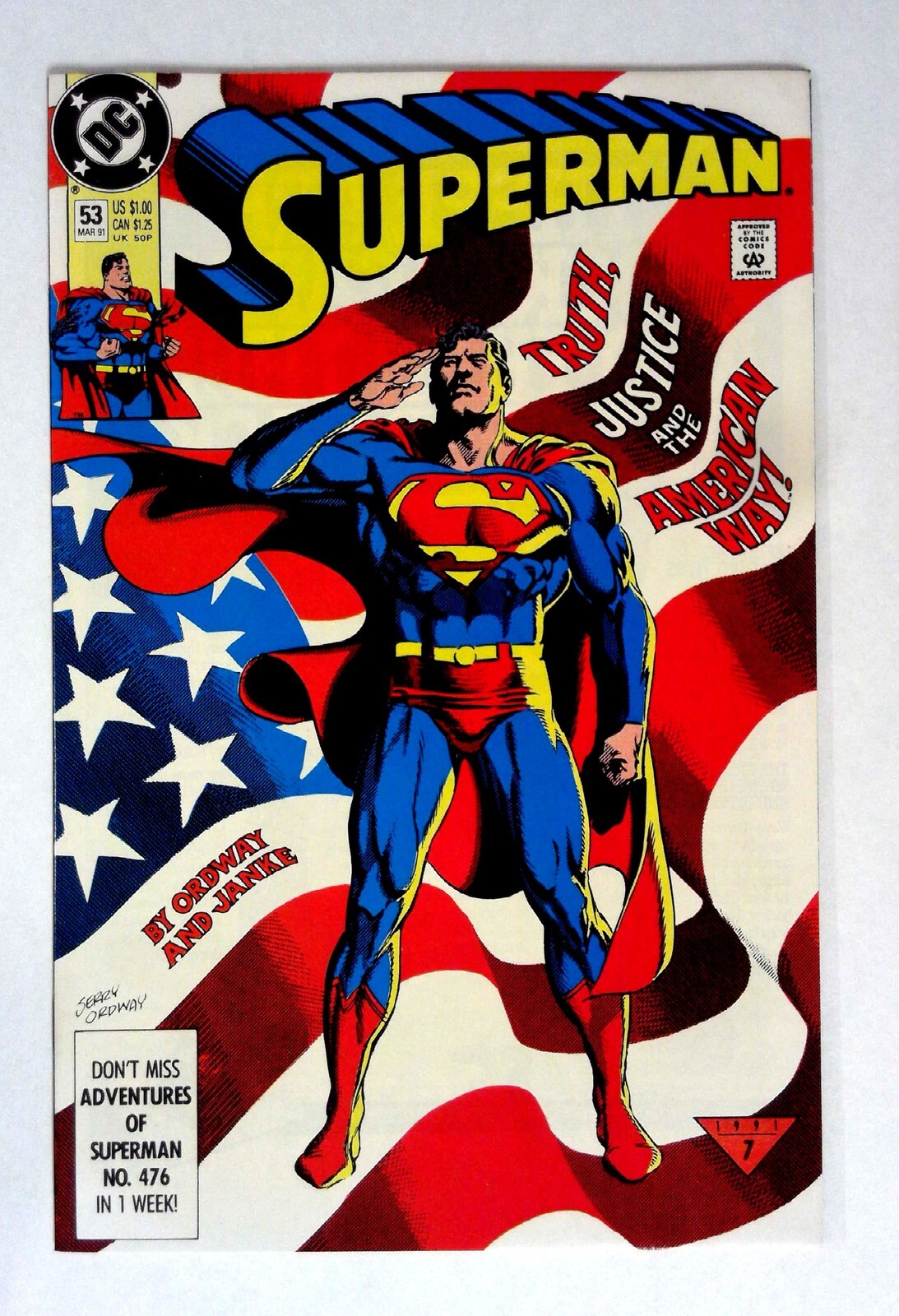 Superman #53 (1991) NM- Superman DC Superman Superman stands triumphant against a backdrop of the American flag, embodying truth, justice, and the American way. This issue features compelling art by Jerry Ordway and ... Read More