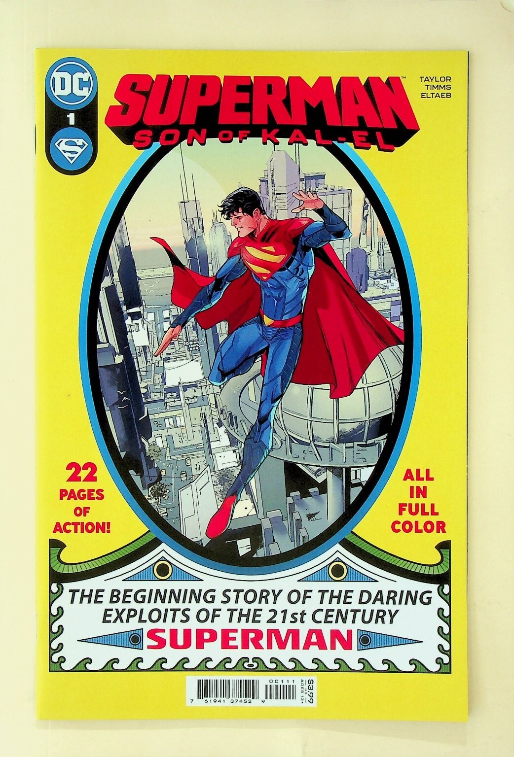 Grade: 9.2 Near Mint-...This is a single issue of SUPERMAN SON OF KAL-EL #1 published by DC Comics. This modern age comic features the beginning story of the daring exploits of the 21st Century Superman, Jon Kent, the son of Kal-El. The cover clearly states "22 Pages of Action!" and "ALL IN FULL COLOR." Key creators visible on the cover include TAYLOR, TIMMS, and ELTAEB. This issue is a prime example of a contemporary superhero comic book, perfect for collectors and fans of the DC Universe.This listing includes one (1) comic book as shown in the images. The back cover features an advertisement for the HBO Max original series "Titans." The comic is a standard format, full-color issue.Verified Specifications:Publisher: DC ComicsSeries Title: SUPERMAN SON OF KAL-ELIssue Number: #1Item Type: Single IssueEra: Modern AgeFormat: Direct EditionKey Features: First Issue, Jon Kent Superman, 21st Century SupermanIncluded Components: 1x Comic BookBarcode/UPC: 761941374829Language: EnglishGenre: SuperheroCharacter: Superman (Jon Kent)