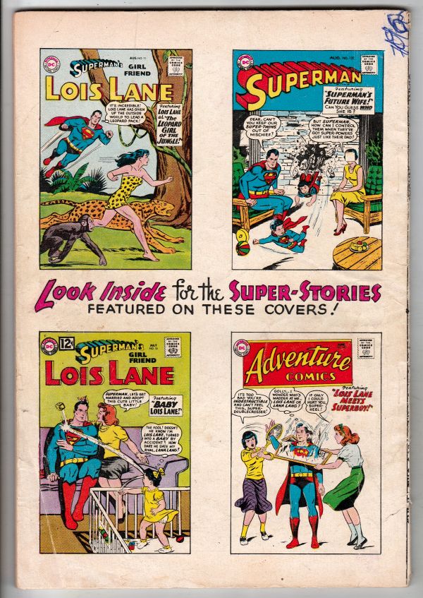 "Superboy Meets Lois Lane"`"The Leopard Girl of the Jungle"`"Lieutenant Lois Lane"`"The Mermaid of Metropolis"`"Lois Lane, Traitor"`"The Cry-Baby of Metropolis"`"The Man Who Was Clark Kent's Double"`"Supermans Future Wife"`"New Hair-Styles For Lois Lane"`"Famous Old Lois Lane Stories"`"Famous Old Covers"