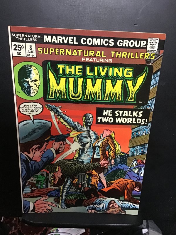 Supernatural Thrillers #8 (1974) Wow! This book has deep rich color and nice eye-appeal on this all time classic Living Mummy cover. With cream/slight heavy cream tint pages and light-cream/cream tint inside covers. ... Read More