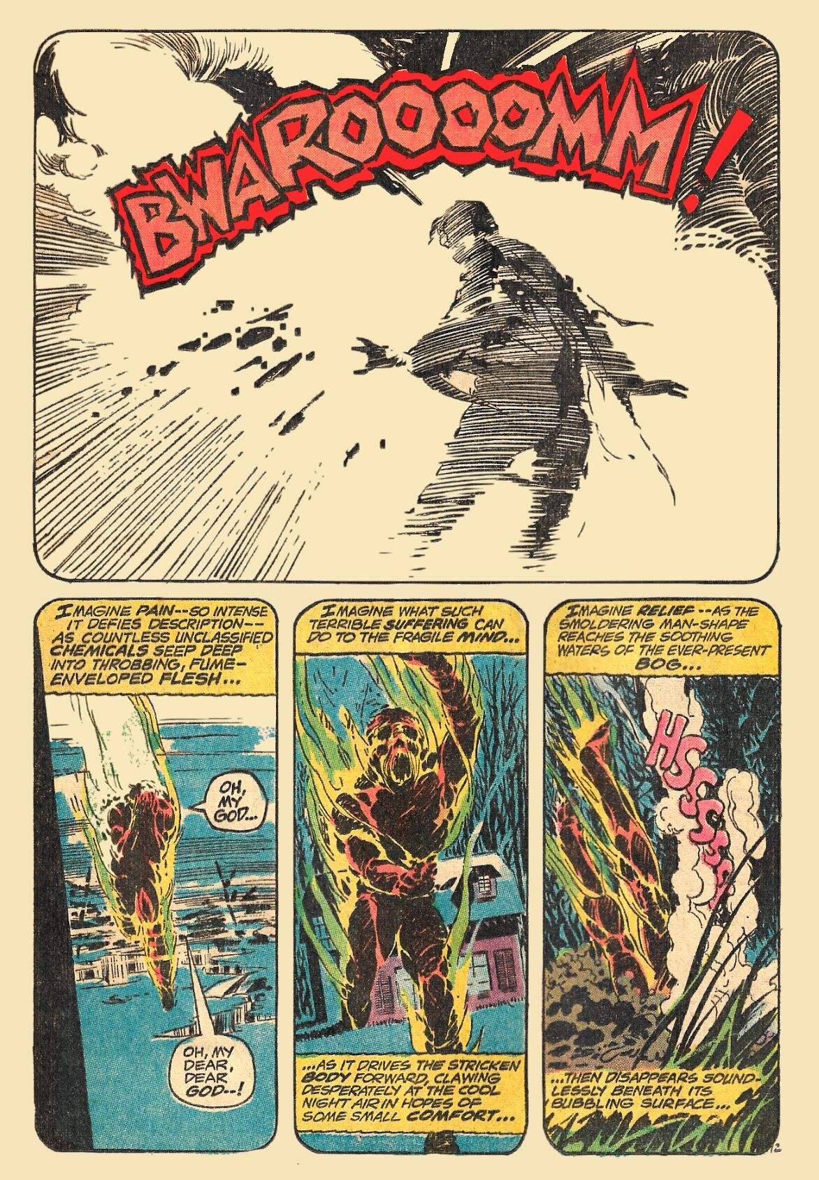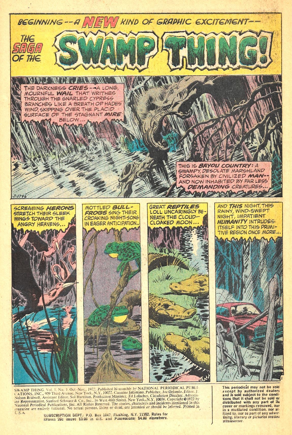 Only 14 months after the publication of the issue that introduced SWAMP THING to the world (in HOUSE OF SECRETS #92), DC gave the sympathetic changeling his own title, with original creators Len Wein and Bernie Wrightson providing the chills!In an altered retelling of SWAMP THING's origin story, scientist Alec Holland, working on a restorative formula that can make forests out of deserts in the Louisiana swamps, is killed by a bomb set by crooks Ferrett and Bruno who want the formula. Holland's body is thrown into the swamp outside by the explosion and shortly thereafter, a humanoid plant being rises from the swamp, transformed by chemical reactions -- SWAMP THING! When the criminals return to dispose of Alec's wife Linda, the SWAMP THING is there to stop them, but too late to save his wife.