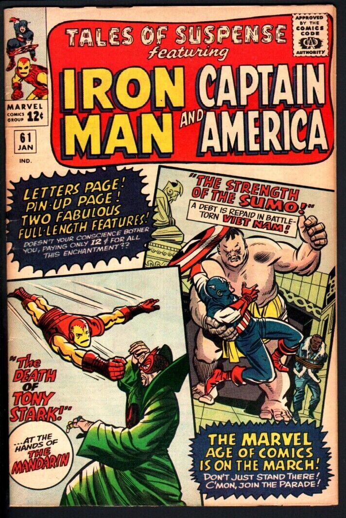 Tales of suspense #61 1965-iron man-captain america-nam vf- captain america in viet nam by jack kirby. Iron man. Gorgeous copy, tight and flat. Small name stamp in bottom margin of very last page. This one is nice, see the scans! 1965 grade: vf- sku: do-05-197
