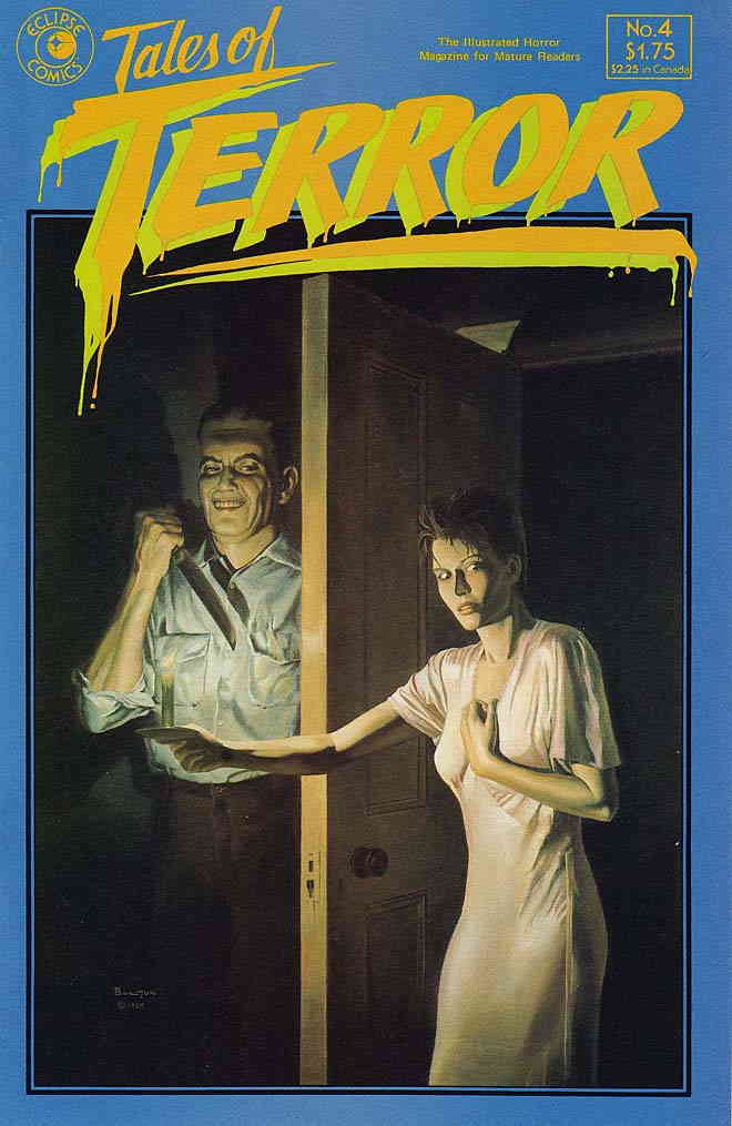 Item: Tales of Terror #4 | Publisher: Eclipse | Cover Date: January 1986 | Writer: Bruce Jones, Beppe Sabatini, Timothy Truman, Charles Wagner | Artist: Gray Morrow, Cara Sherman Tereno, Timothy Truman, Mike Hoffman | Cover Artist: John Bolton | Storylines: Last Laugh; Bear-Bear; Bubby; Bag Limit | With Economy shipping, each additional comic ships for just 50 cents more to customers in the USA. This listing contains a stock photo and information from ComicBase™ and © Human Computing. The stock photo is for reference only. If you would like to see a photo of the actual item, please message us prior to purchasing.Seller Information