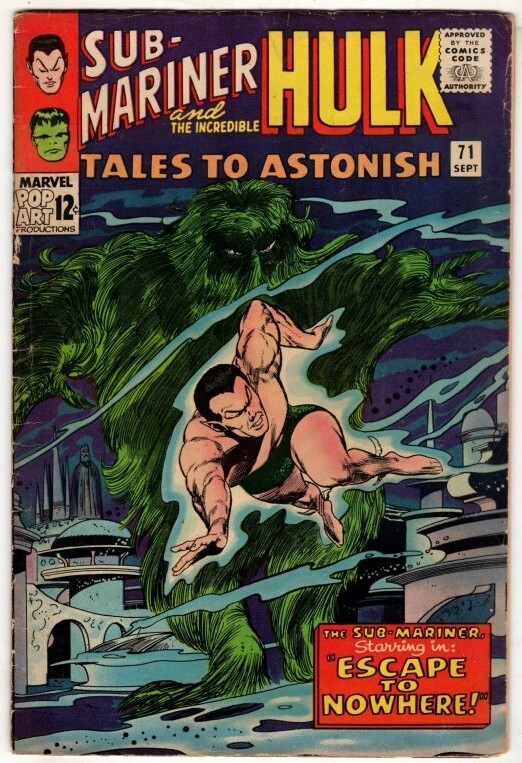 Cover by Gene Colan and Vince Colletta. Escape...to Nowhere!, script by Stan Lee, art by Gene Colan (as Adam Austin) and Vince Colletta; Namor heads into the Forbidden Deeps as he continues his quest for Neptune's Trident; Krang sends Seaweed Man to stop him; Meanwhile, back in Atlantis, the natives are beginning to get restless under Krang's iron rule. Like a Beast at Bay!, script by Stan Lee, art by Jack Kirby and Mike Esposito; The Hulk and Rick barely make it out of the blast radius as Ross fires the giant "Sunday Punch" missile at the Leader's giant Humanoid bringing the massive robot down; The pair decide to hide in their underground cave but are spotted by military planes as they enter; Ross and Talbot attack, threatening the underground complex and Bruce's gamma machine; The Hulk pushes Rick out to safety just as the Leader appears.