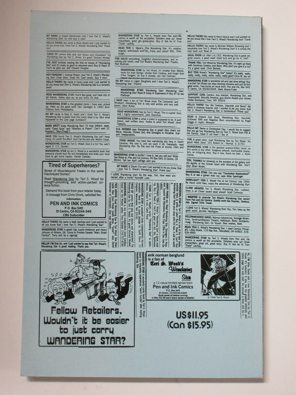 Condition: New from distributor hints of shelf wearFREEBIE FUN PACKS with EVERY package See our e bay store for MORE SETSMORE TRADES & GRAPHIC NOVELSTeri S. Wood Wandering Star Volume 1 Signed with CardsCLASSIC INDIE SCI FI EPICVF/+ ConditionEnd Of Description ======================================Read this legend for an understanding for how our grading system works:M = MintA perfect, unread comic. White pages, sharp corners, perfectly aligned cover, tight staples, sharp square corners, no creases, marks, fading of any kind - no flaw whatsoever. We have never actually graded a book as MINT. To quote Phil Seuling: "Mint is a flavor of chewing gum."NM = Near MintThis is what most comics look like when purchased new, presuming no harassment on the racks. Tight staples, glossy cover, sharp corners, no marks, white pages. Any flaws are HINTS of a flaw. Maybe look very closely and you the perfectionist will see a miniscule mis-alignment of the cover with the pages, or the hint of the rounding of a corner. Run your fingers down the spine and you may feel a crease which isn't visible to the eye. Those are the kind of things which mean that nearly all "as new" comics are graded as Near Mint rather than Mint. You will notice that in our 1000s of listings, we don't use this grade either. VF-NM is usually our top grade.VF = Very FineExcellent condition. Sharp, bright and clean. May have minor spine wear or a small corner crease, or slight surface wear. Often, at first glance a Very Fine comic will appear Near Mint, although closer inspection will reveal trace ( but distinct) imperfections. This is typically the best grade seen for Silver Age comics.F = FineA nice book, still attractive to look at. An optimistic first glance might reasonably hope for a VF or even a VF-NM. Staples still firm, there is at least some gloss, good corners, but closer look reveals yet more imperfections.VG = Very GoodA solid book. Immediately visible but not dramatic flaws - conversely no dramatic virtues either. Just clean somewhat worn and solid. Maybe some creases but no significant tears. Staples still solid. Book still solid, but clearly worn. G = GoodAs VG, but with flaws more pronounced. Creases are a little bigger, maybe a larger tear, staples still well attached, but may have stress tears around them. There may be small chips out of the cover. The wear is everywhere but the book is still sound. FR = FairA Fair comic is well worn with large flaws, but the book and cover are still, possibly a piece or two missing from the cover, a staple may be loose. OK for a reader, a cheap placeholder for a collector.PR = PoorAny graded book should be complete. A book in POOR has its cover and all its pages. Things may be loose or waiting to get lost, there may be a piece missing here or there, but the book is there. Still readable. We do not give incomplete books a grade. Note that when a grade appears as (VG-F) or something similar, it means the book was somewhere in-between the two selected grades. And when a listing appears as (G+), it means that the book was slightly better than the grade described, or slightly less in the case of (G-). ===================================== Holiday (AND ALWAYS) SHIPPING SCHEDULE: Almost all auctions ship within 1 business day after receiving payment, usually in 24 hrs or less; Nifty FREEBIE FUN PACK of Comics and Cards accompanies ALL (yes ALL!!) packages. Payment may be made via PayPal or credit cards.Pick up by appointment for all auctions and listings. Call [phone removed by Hip] for pickup payment options.AMERICANEXPRESS,VISA,MASTERCARD DISCOVER OKetc).End Of Postage and Payment Terms
