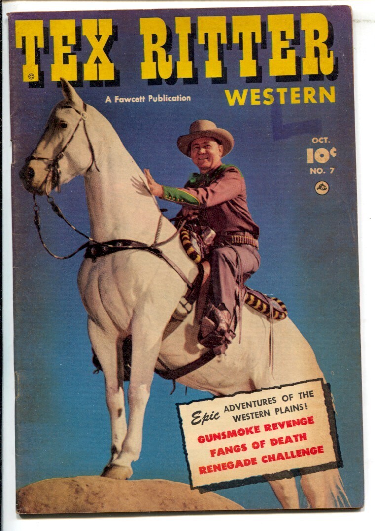 Grade: VG+Tex Ritter #7 1951-Fawcett-Portrait photo cover-"Fangs Of Death"-VG+ -Portrait photo cover -"Fangs Of Death" -Looks FN but has a few light stains Grade: VG+ SKU: PULP008-232