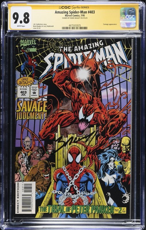 The Amazing Spider-Man (1995) # 403 (CGC 9.8 WP) Signed Mark Bagley * census=2