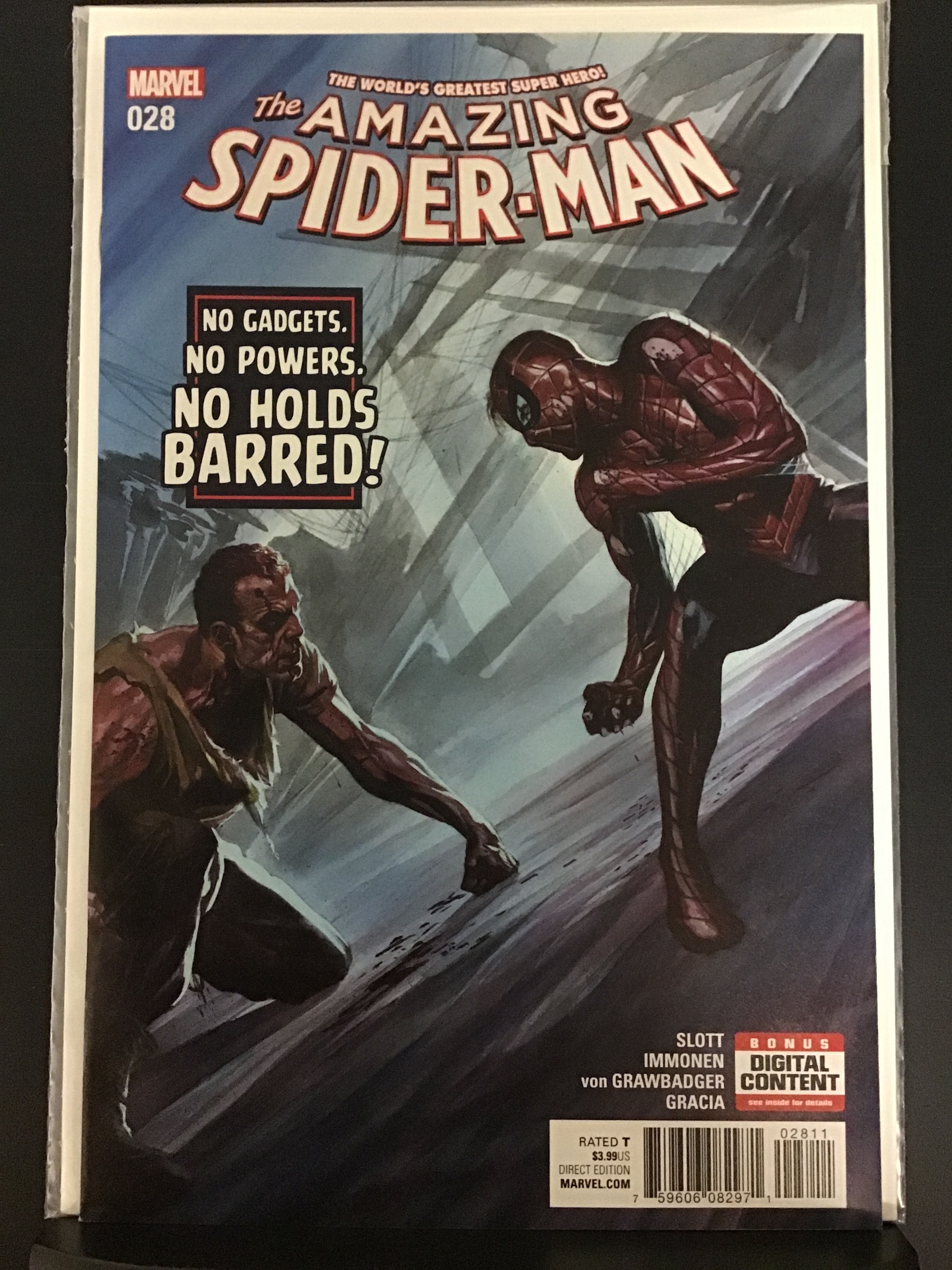 The Amazing Spider-Man #28 (2017) Title Issue# - Description (Grade) YearCondition/NotesSize: 7" x 10"This item was uploaded by ______WE COMBINE SHIPPING!!! Either wait for us to send you an invoice after you commit to buy or, if it makes you pay right away, message us back and we'll refund the excess charge.Buy as many single comic books as you want for one low flat shipping rate in the United States! International will be charged exact according to size and weight.If you have any specific questions or requests, please ask us prior to ordering and we'll get back to you as soon as we can.If there are any problems with your order whatsoever, please message us before leaving feedback and we'll be happy to work with you to fix the situation!We ship worldwide, combine purchases, and charge exact shipping. The price may vary based on size, weight, and location. If you are automatically overcharged for shipping, message us and we'll be happy to revise the invoice or refund you the excess amount. If you have any questions regarding shipping, please message us.International Buyers - Please Note:Import duties, taxes, and charges are notincluded in the item price or shipping cost. These charges are the buyer's responsibility.Please check with your country's customs office to determine what these additional costs will be prior to bidding or buying.Payment can be made by PayPal and credit cards directly.Frequently Asked Questions:When are your operation hours?Our in office hours are Monday - Friday, 11 am - 8 pm. We are not open on weekends, so if you send us a request on Friday evening we won't get back to you until Monday afternoon. Please don't take it as us ignoring you! We will work on your request Monday and get back to you as soon as we can. Also, if you order from us on a Friday evening or Saturday morning we won't start processing your order until we open on Monday. That means on Monday it will be pulled and prepped for shipping, then picked up by the postman on Tuesday morning.When will you ship my item? The tracking hasn't moved.We realize you're eager to get your item, so if the tracking hasn't moved in a few days please don't be concerned. We give the postman a lot of packages daily, sometimes as many as 100, so he does not scan each item for us upon pickup as he says it would be too time consuming for him to do so. If you get a tracking number from us, that almost always means your item was picked up by the postman the next business day. The USPS is also imperfect. There are times when the tracking won't even show movement until it's in your area's regional distribution center. This is normal in our experience.Is the item pictured the exact one for sale?Yes! We don't use stock images and go through great lengths to scan or photograph everything we list. The item pictured is exactly what you should receive UNLESS it is a fixed price listing with multiple items available.Can you issue a COA?We can, upon request. Please make sure you leave us a note while checking out and shoot us a message immediately after requesting one, just to be sure.How Do You Grade?Grading is very subjective, but we are professionals with decades of grading experience between us who try the best we can to accurately describe the condition of the items we list.Anthony is an Overstreet Comic Book Price Guide AdvisorPlease see the grading chart below for a breakdown of how we grade:NOTE: We don't grade any raw books higher than 9.2, as once you go higher than that grading gets really subjective. If you buy a NM book from us, it may very well be higher than 9.2 but we play it safe and grade conservatively.9.2 NM Near Mint9.0 VF/NM Very Fine/Near Mint8.5 VF+ Very Fine+8.0 VF Very Fine7.5 VF- Very Fine-7.0 FN/VF Fine/Very Fine6.5 FN+ Fine+6.0 FN Fine5.5 FN- Fine-5.0 VG/FN Very Good/Fine4.5 VG+ Very Good+4.0 VG Very Good3.5 VG- Very Good-3.0 GD/VG Good/Very Good2.5 GD+ Good+2.0 GD Good1.8 GD- Good-1.5 FR/GD Fair/Good1.0 FR Fair0.5 PR PoorHow Do You Ship Comics?We ship in rigid cardboard mailers to protect your comic book from the worst the mail system has to offer. Price varies based on the number of books you purchase, but we try to keep costs as low as we can and charge exact shipping. If it looks unusually high to you please send us a message and we'll be happy to double check for you.Do You Combine Shipping?Yes, of like items. Such as: several comics can fit in one cardboard mailer, as can more than one record. Multiple art pages can easily be combined because they are light and thin. Where combined shipping differs is with size and weight. For instance, two statues require a much bigger box. Same goes for CGCs, as the package gets bigger and heavier as you go.Do You Ship Well? I've Had Some Bad Experiences...You needn't worry; we are professionals who value your business and want your item to arrive safely as much as you do. I have been collecting for over 30 years. I send out items the way I would like to receive them.The tracking says my item is "out for delivery" in new jersey. Why is that?If the tracking indicates that the item is "out for delivery" in nj don't worry, it's just what the tracking says when it's carried over from the postman to the sorting center. This is normal for our post office and will not impact you receiving your item in a timely matter.What Is the Difference Between a Run and a Lot?Good question. A RUN will be a collection of consecutive issues with no breaks in between them. If it says RUN of #s 1 - 50 you will receive 50 consecutive comics. A LOT will be within a certain range, so a 50pc LOT will not contain consecutive books.I changed my mind after successfully winning the auction or fixed price listing, will you cancel the transaction?Please only bid or hit buy it now if you are willing to follow through and pay for the item, we will not cancel the transaction. As a seller, Hip penalizes us every time we cancel an order, so it is detrimental to our business to do so. Therefore if you w