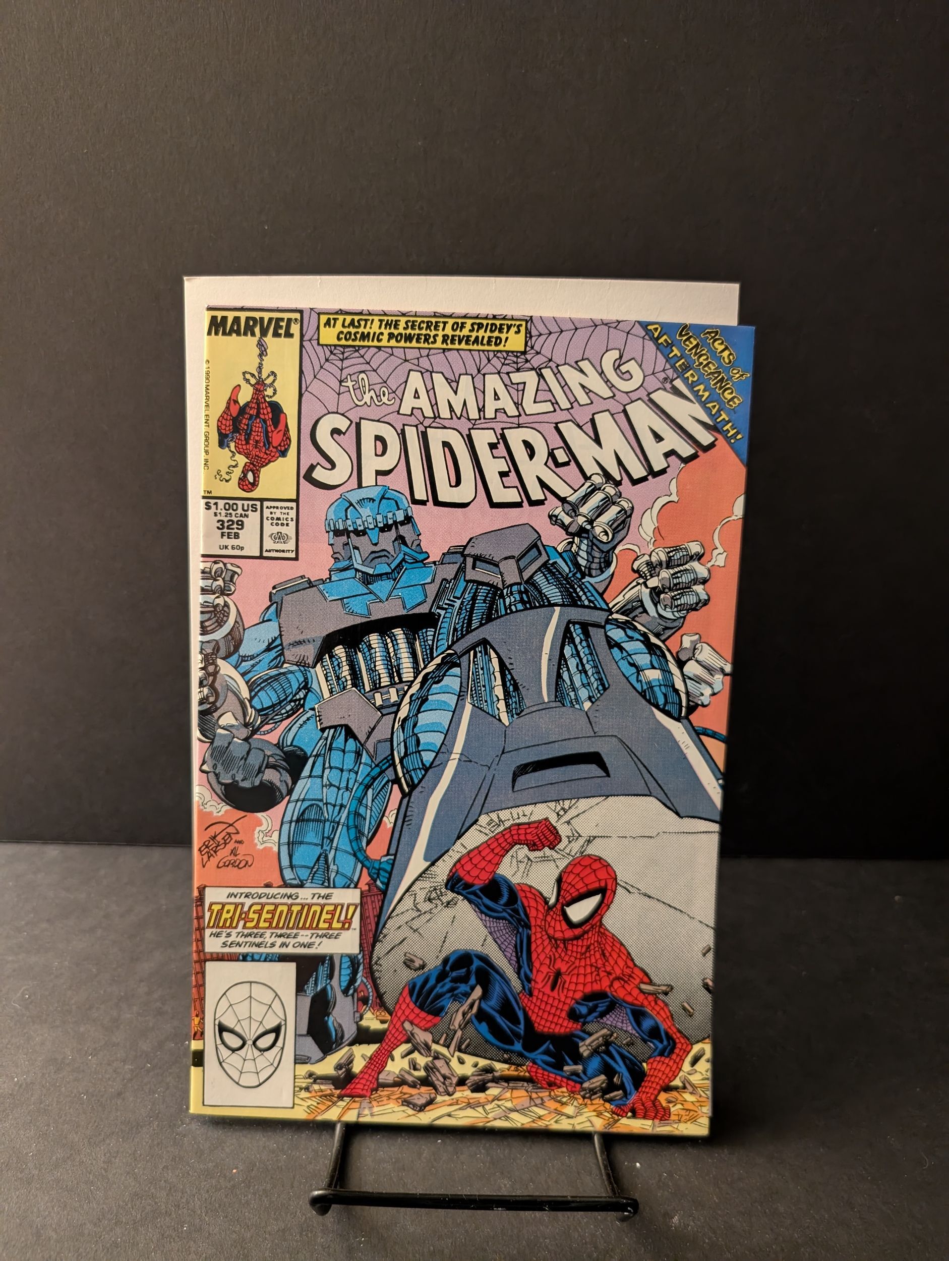 Acts of Vengeance Aftermath - "Power Prey!" Script by David Michelinie. Pencils by Erik Larsen. Inks by Andy Mushynsky. Cover by Erik Larsen and Al Gordon. The Acts of Vengeance is over! But Loki, Graviton, and Sebastian Shaw still want another shot at your friendly neighborhood Spider-Man! Inside Shaw Industries, the X-Men's long-time foe tinkers with past and present Sentinel robots! High above the Earth, the Asgardian god of mischief takes notice and decides to push along Shaw's research by merging the prototypes into the Tri-Sentinel! And then Loki sends the gigantic robot to destroy the Amity Point nuclear power plant! Is the end near for New York City? Not quite! In a brilliant flash of light, the Amazing Spider-Man transforms into Captain Universe! And with the enigma force pulsing through his veins, the wondrous wall-crawler charges the Tri-Sentinel! Can the spectacular one prevent a nuclear meltdown in the Big Apple? In Spidey we trust! Cameo appearances by Mary Jane Watson, Flash Thompson, and the Black Cat. (Notes: This issue begins Erik Larsen's 2-year run as the penciler of the Amazing Spider-Man title. This story was reprinted in 1993 in the trade paperback: Spider-Man -- The Cosmic Adventures.) 36 pages. Cover price $1.00.Seller Information