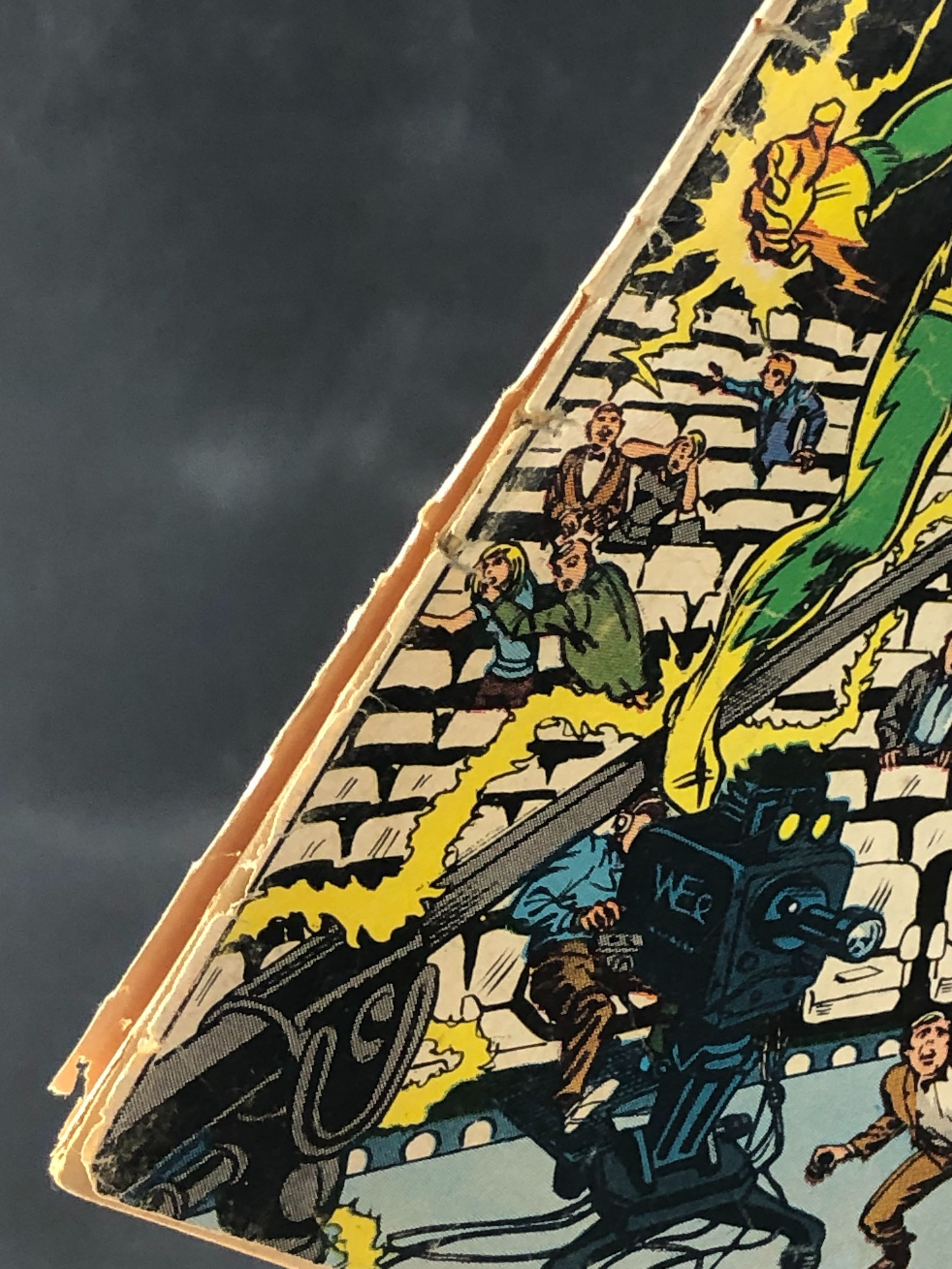3 1/2" spine tear a bottom. 1/2" at top.Coupon cut, along with a panel with Spidey.