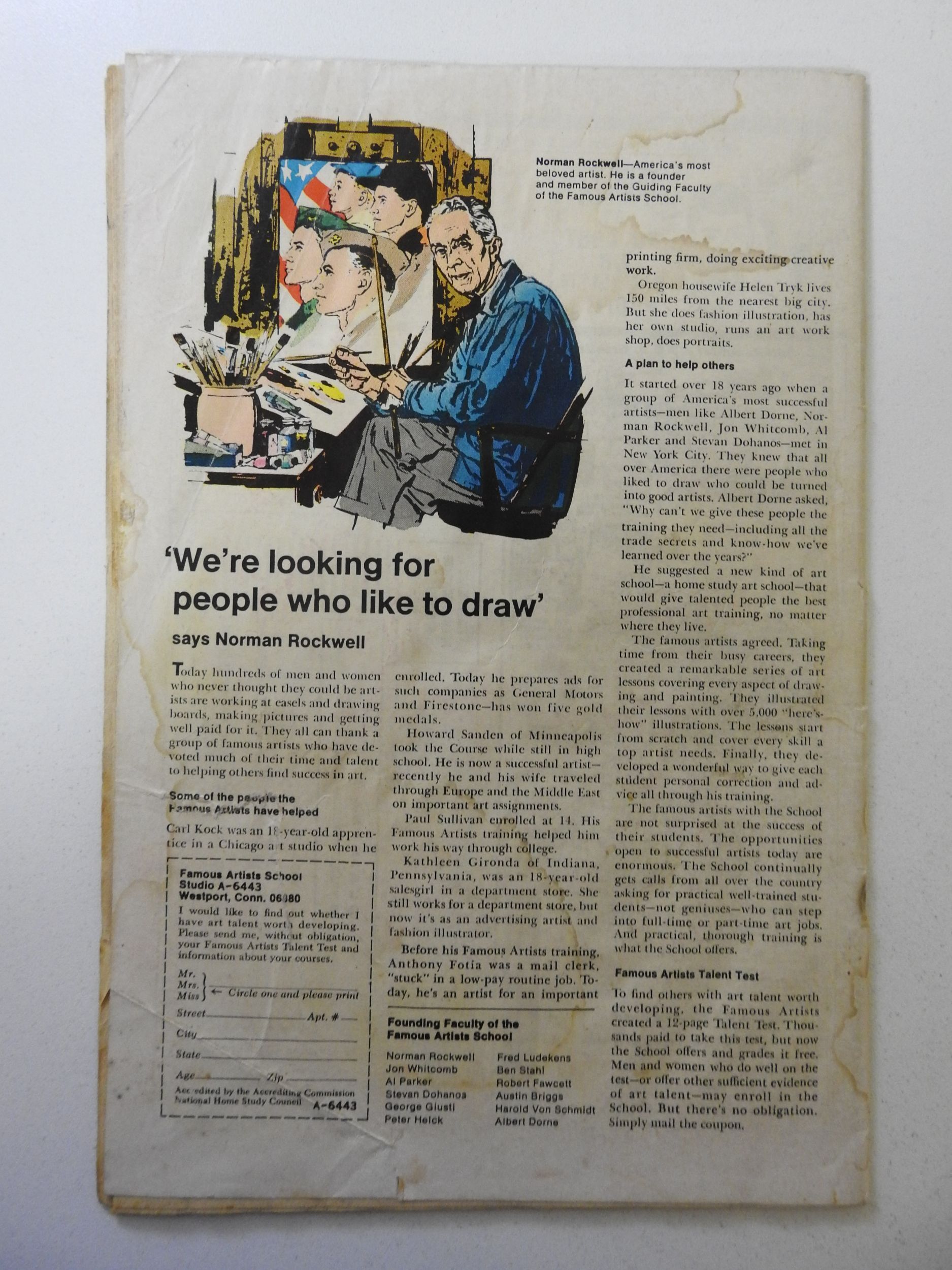 moisture damage, 2 in tear bc, date stamp fc, centerfold detached bottom staple