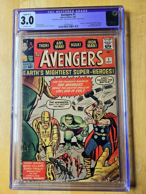 LCGC - 1st appearance & origin of the Avengers (Team). As you can see, this is marked with the purple label as "restored" this is for tape on the inside back cover and color correction on the cover (which I am hard pressed to identify). This title is a must have for many of us, I wish I could keep it for myself, but I am selling this for a friend (see details).DETAILS - This comic is obviously graded by CGC. I am selling this comic for a good friend who owns it. This was stored in a long box by him for approximately 40 years, bagged. It was been re-bagged and boarded, then sent off and cleaned and pressed professionally and submitted for grading. The images provided are front and back of the CGC packaging, I encourage you to look at the notes if you wish. Feel free to communicate within the HipComics platform if you have questions.