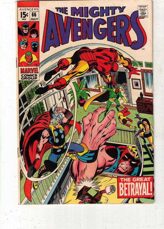 The Avengers #66 Jul 1969 ORIGINAL LIST PRICE $197.00 VF/NM Issue: #66 Name: Betrayal Publisher: Marvel Titles: The Avengers Released: Jul 1969 Variants: 0 First Appearances: Myron MacLain Long absent members ... Read More