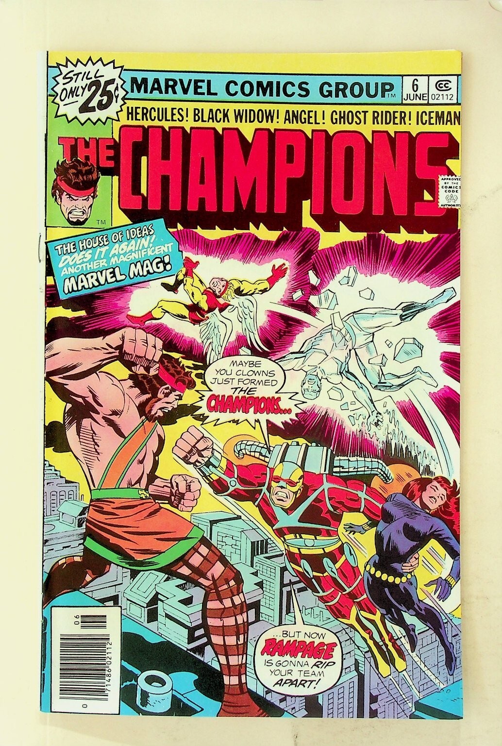 Grade: 8.0 Very FineThis is a single issue of The Champions #6, published by Marvel Comics Group. This vintage comic book features a dynamic cover showcasing key characters such as Hercules, Black Widow, Angel, Ghost Rider, and Iceman, as they confront Rampage. The cover proudly announces "Still only 25¢" and carries the publication date of June 1976. This issue is a classic example of a Bronze Age comic, offering a snapshot of Marvel's creative storytelling from that era. As a collectible piece of comic book history, it's a great addition for fans of Marvel superheroes and classic team-up series.This listing includes one (1) comic book, presented as a loose raw comic. The back cover features a classic "Make Money Get Prizes" advertisement from American Seed Co., a common sight on newsstand editions of the era. This comic book is an excellent example of a traditional US comic and a piece of comic book lore.Verified Specifications:Publisher: Marvel Comics GroupSeries Title: The ChampionsIssue Number: #6Item Type: Single IssueEra: Bronze AgeFormat: Newsstand EditionKey Features: First appearance of RampageIncluded Components: 1x Comic BookCountry of Origin: USA