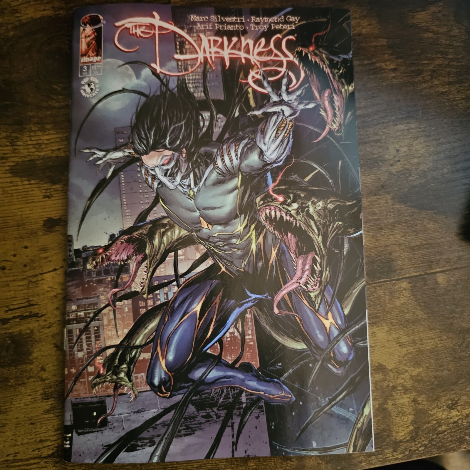 Grade: 9.4 Near Mint"Mafia Hitman Jackie Estacado was both blessed and cursed on his 21st birthday when he became the bearer of The Darkness, an elemental force that allows those who wield it access to an otherworldly dimension and control over the demons who dwell there. Forces in the world rise up to face Jackie and the evil his gift represents. There is one small problem in this story…evil is good." (From the Image Comics site) Issue 3