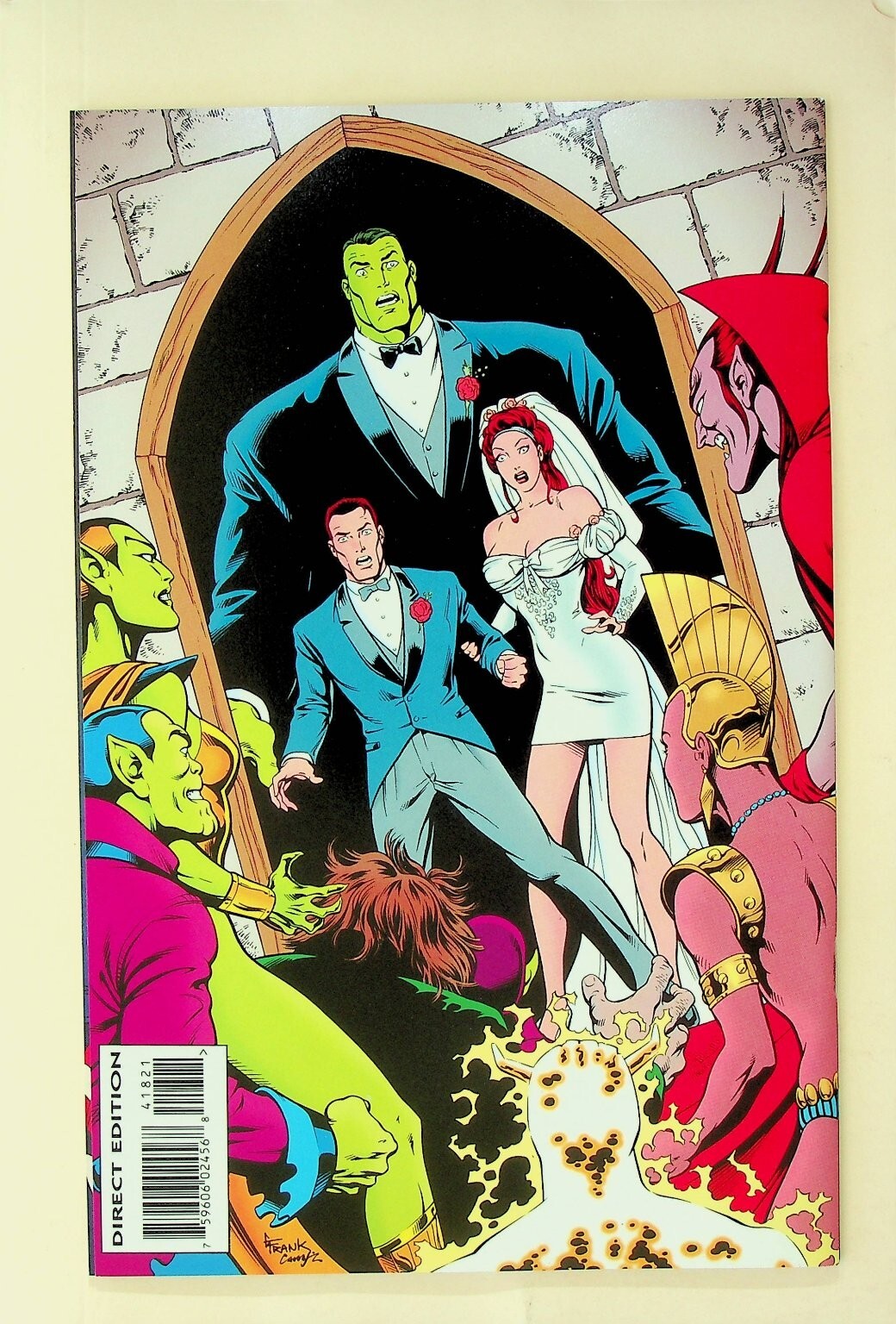 Grade: 9.2 Near Mint-...This is a single issue of The Incredible Hulk #418, published by Marvel Comics. This highly collectible comic features the memorable wedding of Rick Jones and Marlo Chandler, a significant event in the Hulk saga. The cover price is $2.50 US, and it is identified as a Direct Edition, featuring a unique gatefold cover with artwork by Frank Cirocco. This issue showcases Bruce Banner's alter ego, the Hulk, in a surprisingly emotional role at the wedding.This listing includes one (1) comic book as pictured. It is a key issue for collectors interested in the long-running Marvel Comics series, "The Incredible Hulk," and features a distinctive cover that captures a pivotal moment for supporting characters. The vibrant cover art and the significant story event make this a notable addition to any comic book collection.Verified Specifications:Publisher: Marvel ComicsSeries Title: The Incredible HulkIssue Number: #418Item Type: Single IssueEra: Modern AgeFormat: Direct Edition, Gatefold CoverKey Features: Rick Jones & Marlo Chandler Wedding, Frank Cirocco Cover Art, Key IssueIncluded Components: 1x Comic BookCountry of Origin: USALanguage: English