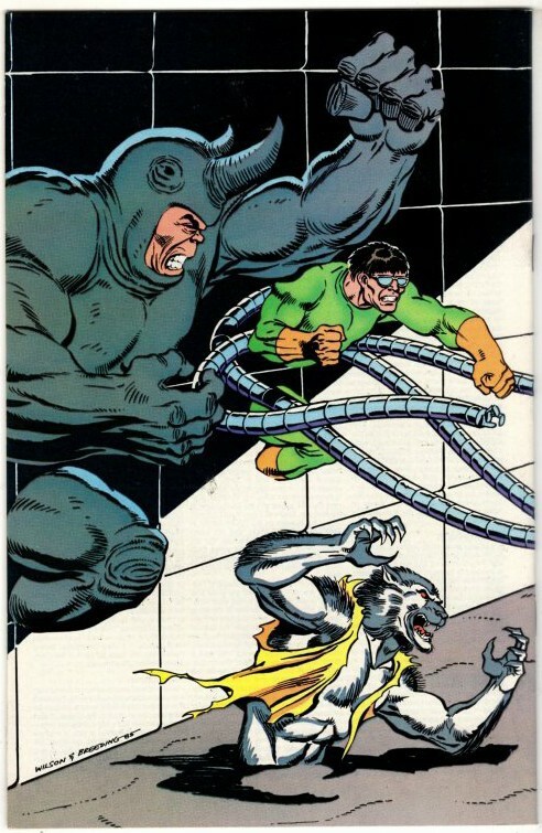 The wraparound cover depicts Doctor Octopus, the Green Goblin, Man-Wolf, Rhino, and the Vulture phasing through the walls to attack the wondrous wall-crawler. The cover resembles the cover to Amazing Spiderman #170.