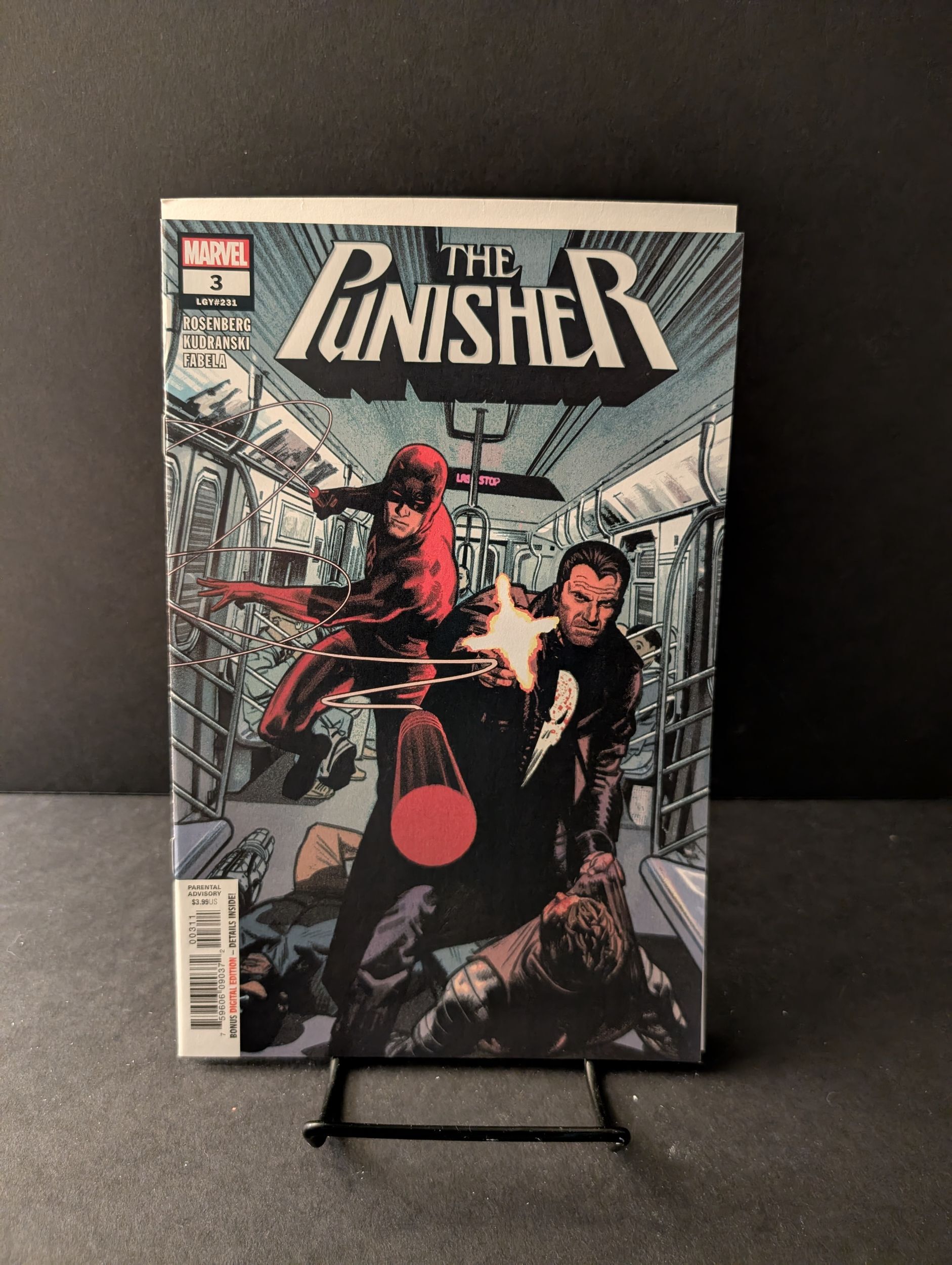 World War Frank: Part 3 of 5 - Written by Matthew Rosenberg. Art by Szymon Kudranski and Antonio Fabela. Cover by Greg Smallwood. A SUBWAY STRUGGLE FOR SURVIVAL! The Punisher attempts to escape his attackers, but they follow him into New York's subways! Frank's nearly overtaken when the protector of Hell's Kitchen, Daredevil, joins the fracas. But Daredevil wants to put Frank down just as bad as the mercenaries do! 28 pages, full color. Parental Advisory Cover price $3.99.Seller Information