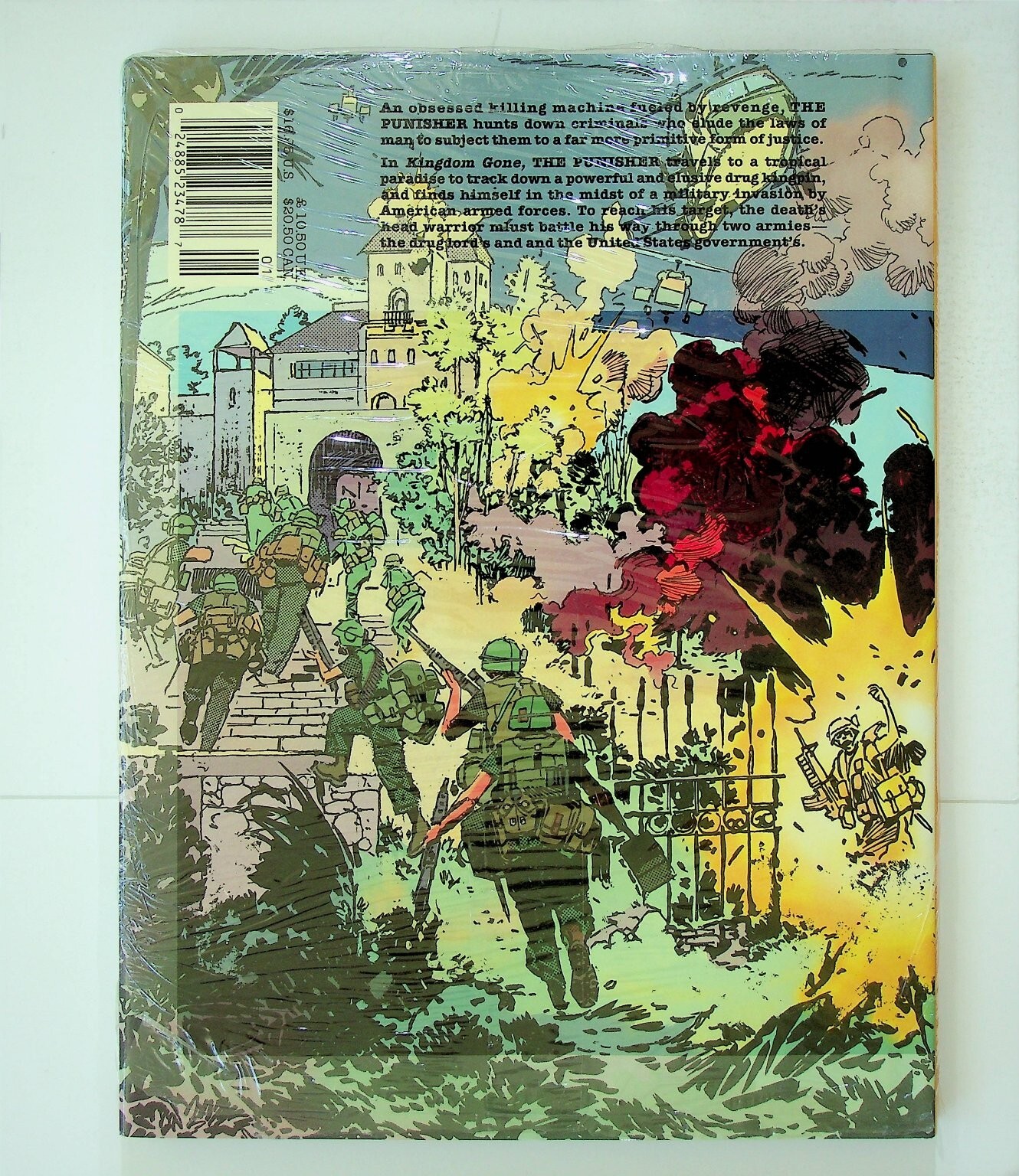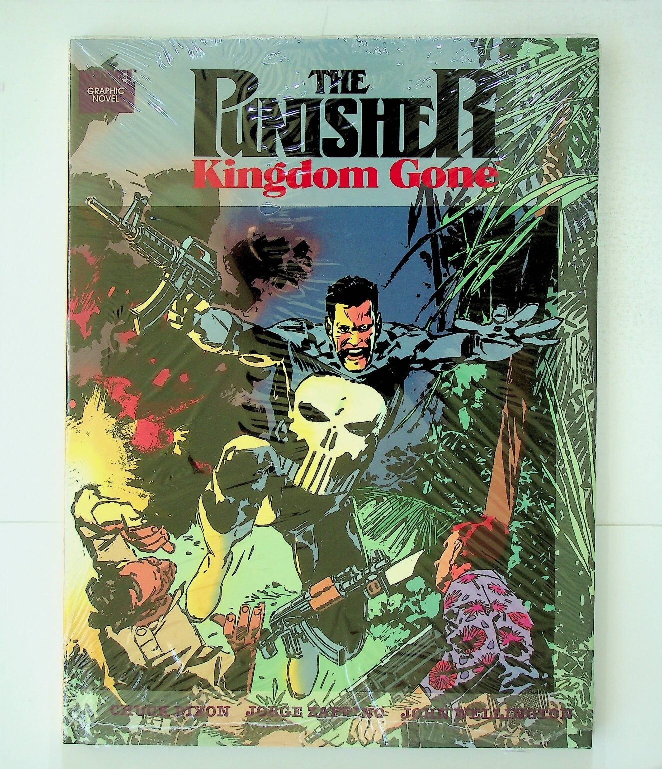 This is a graphic novel titled "The Punisher: Kingdom Gone." Published by Marvel Comics, this collectible item features the iconic Marvel anti-hero, The Punisher (Frank Castle). The graphic novel format collects a complete story arc, offering a continuous reading experience. The cover art depicts The Punisher in a jungle setting, engaged in combat, showcasing the gritty action typical of the character. The back cover provides a synopsis, detailing Frank Castle's pursuit of justice and his journey to a tropical island. This graphic novel is a key addition for fans of The Punisher, Marvel Comics, and modern age superhero stories.This listing includes one (1) graphic novel, still sealed in its original polybag/plastic wrap. The item features a barcode/UPC of 024885247814 and an original cover price of $14.95 US / $22.50 CAN. Key creators listed on the cover include Dixon, Jorge Zafariño, and John Wellington, contributing to the story and cover art. This graphic novel is a great piece for any collector of comic books and graphic novels, especially those interested in the darker, more mature side of the Marvel Universe.Seller Information