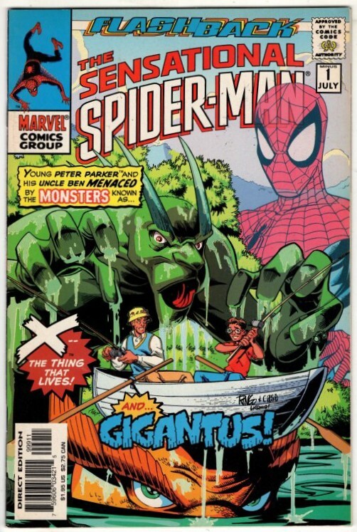 "Here There Be Monsters!" Script by Todd Dezago. Pencils by Mike Wieringo. Inks by Richard Case. Cover by Mike Wieringo and Richard Case. Narration by Stan Lee. Before Peter Parker was bitten by the radioactive spider, he went on a fishing trip with his Uncle Ben to Westchester County! It was a quiet and relaxing day on the water...until the monsters attacked! Gigantus! Groot! Blip! Vandoom's Monster! And X -- the Thing that Lives! Wow, how will young Peter escape from this quintet of golden age monsters? Maybe he won't have to if his fishing trip is all a dream! Or perhaps all a nightmare! Cameo appearances by Aunt May and Nightmare. (Notes: This one-shot issue was part of Marvel's company-wide "Flashback" event. This issue was published in July 1997 between Sensational Spider-Man 17 and 18.) 40 pages.