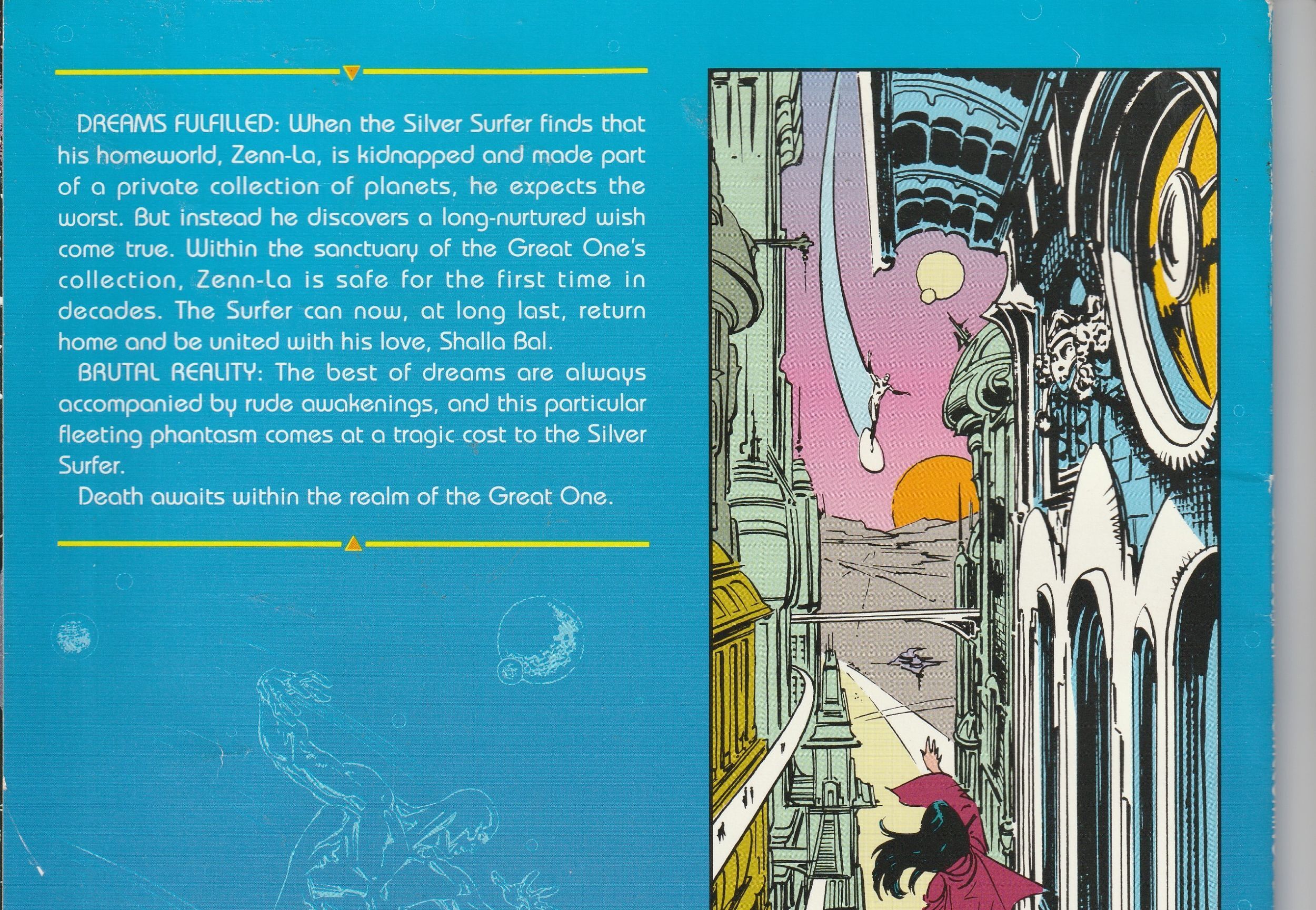 Very Fine/Near Mint Condition - Negligible cracks on front and back of spine but cover and interior pages in pristine condition.The Silver Surfer and Avenger Moon Dragon are the only hope to rescue Zenn La from a cosmic mind on par with Galactus ! Story by Thanos /Dreadstar creator Jim Starlin with art by Badger/Punisher artist Bill Reinhold