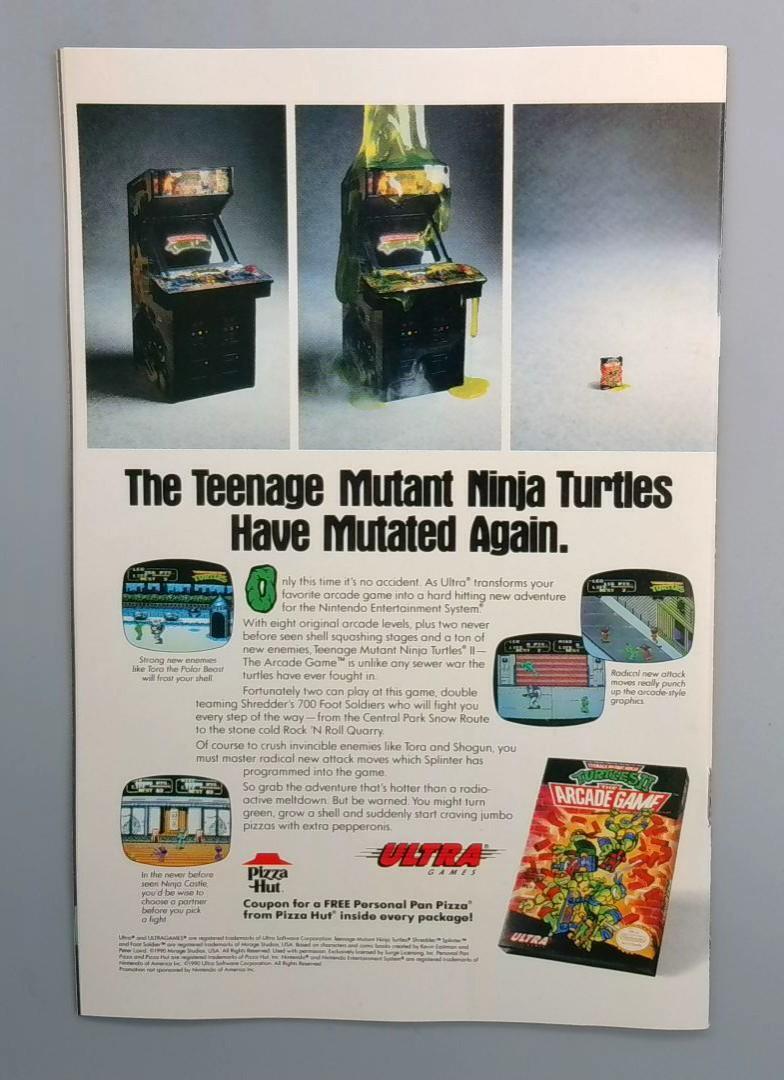 BACK COVER ADVERTISEMENT: Features the Teenage Mutant Ninja Turtles II: The Arcade Game for Nintendo Entertainment System, promoting the arcade game adaptation with Pizza Hut coupon offer for a free Personal Pan Pizza included in every package.