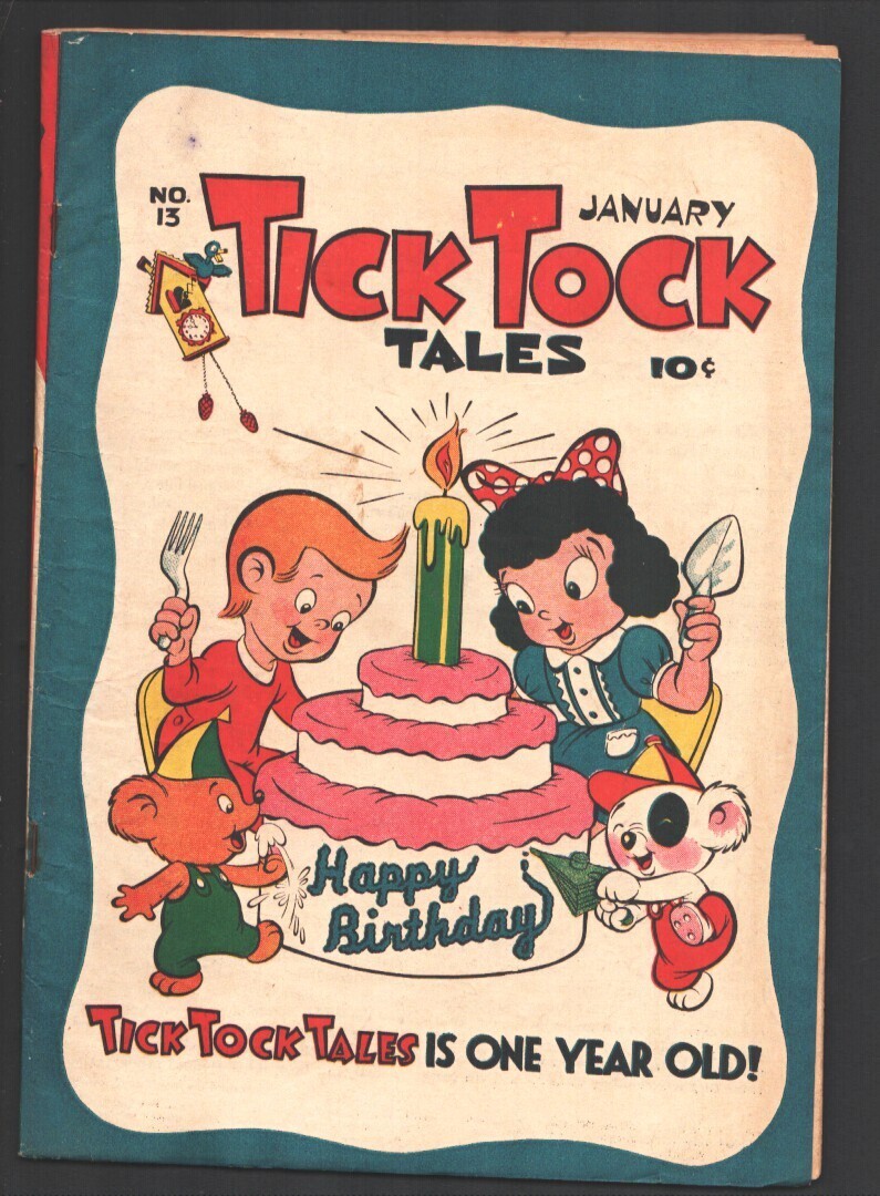 Grade: VG+Tick Tock Tales #13 1947-ME-Koko & Kola-Pixies & Chuck Chipmunk-Tom Tom Jungle Boy-Birthday cover-VG+ -Koko and Kola -Pixies and Chuck Chipmunk appear -Tom Tom the Jungle Boy -Birthday Cover-Tick Tock Tales is One Year Old Grade: VG+ SKU: U1-37-112