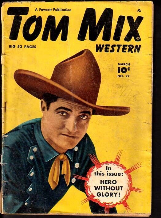 TOM MIX WESTERN #27-PHOTO COVER-FAWCETT P/FR Great vintage golden-age comic. Don't pass this one up. Comix card has been removed, 1/3 of page missing. Extra staple. 1950 Grade: P/FR SKU: BC05-097
