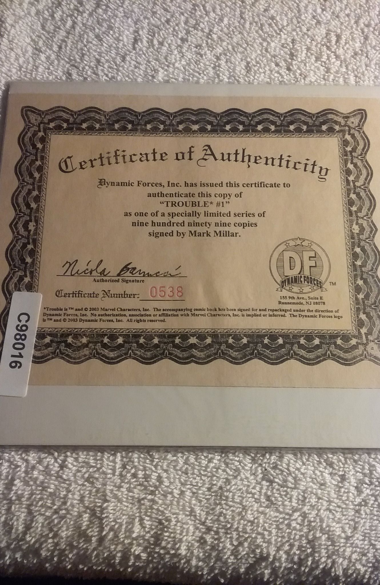 this book is number 1 office. This is signed by Mark Millar. This book is sealed with Dynamic Force seal that has not been damaged. Includes certificate of authenticity and numbered
