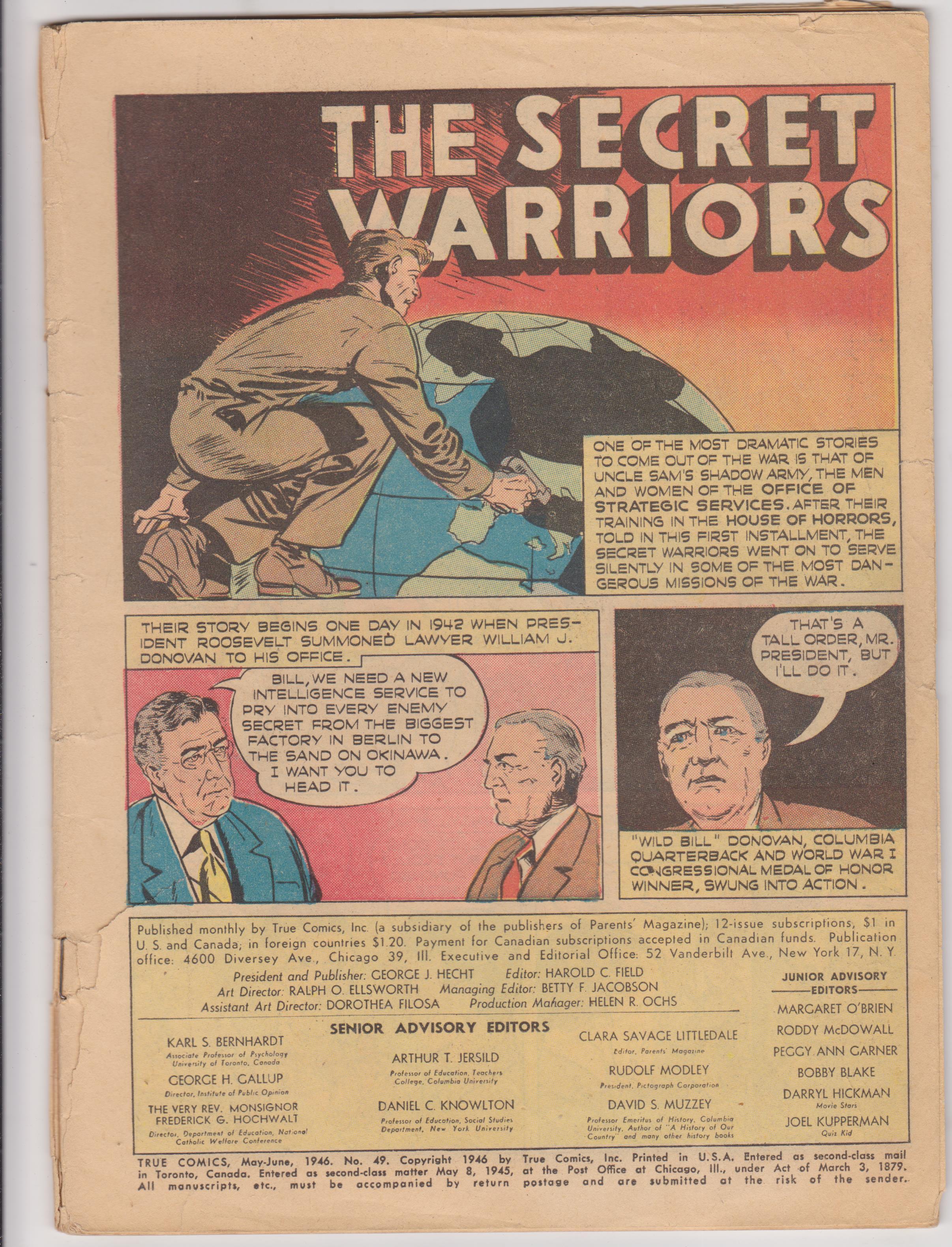 True Comics by True Comics Inc copyright 1946. I have graded the comic book at POOR with the following defects: The cover is missing. Light stress marks along the spine. Corners are rounded. Tear near the lower left corner. There is yellowing of the pages.Seller Information