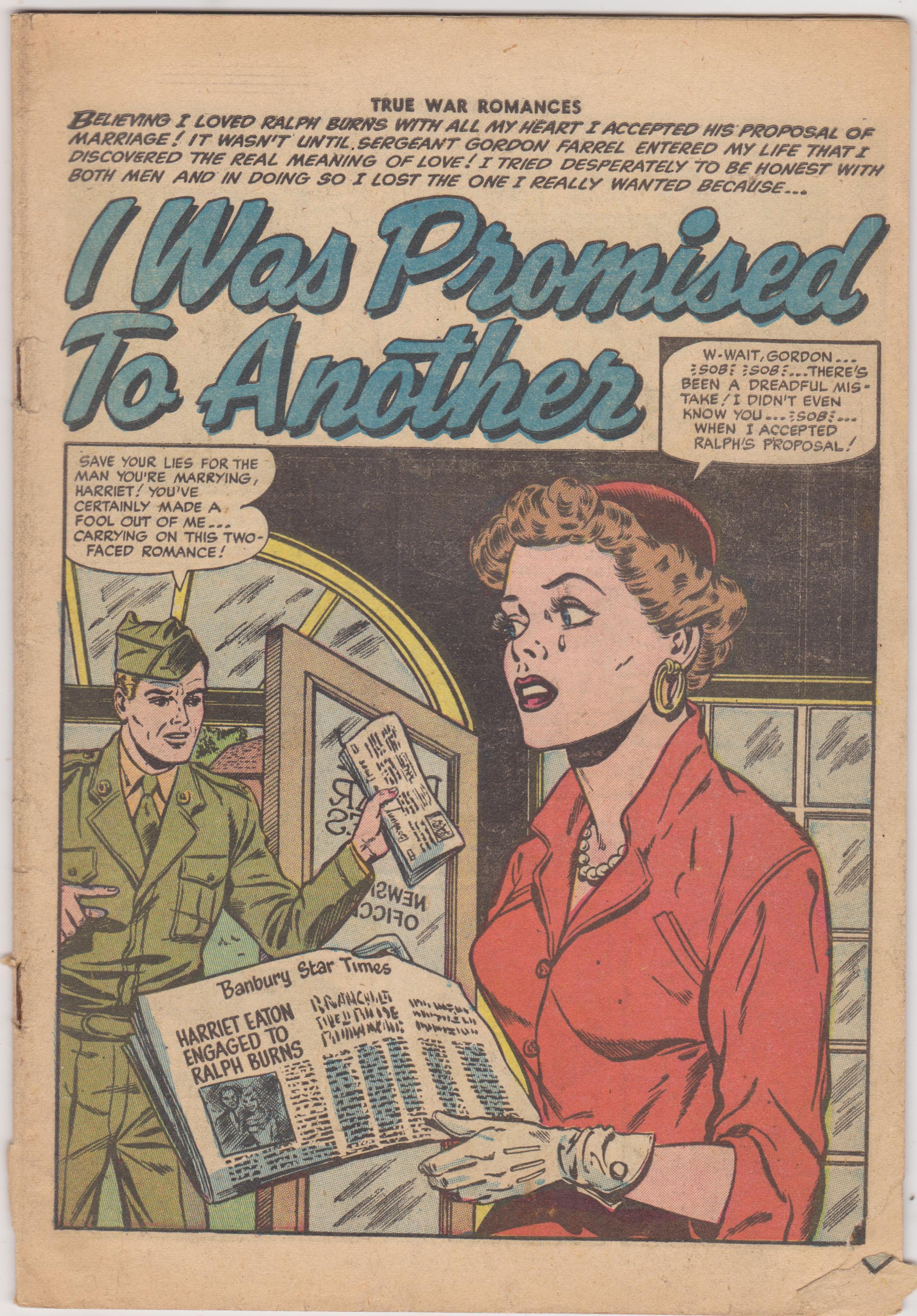 True War Romances #17 by Quality Comics copyright 1954. I have graded the comic book, using the Overstreet Grading Guide, at POOR with the following defects; Cover is missing. Light stress marks along the spine. Tear in the lower right and lower left corners. The pages are yellowed.Seller Information