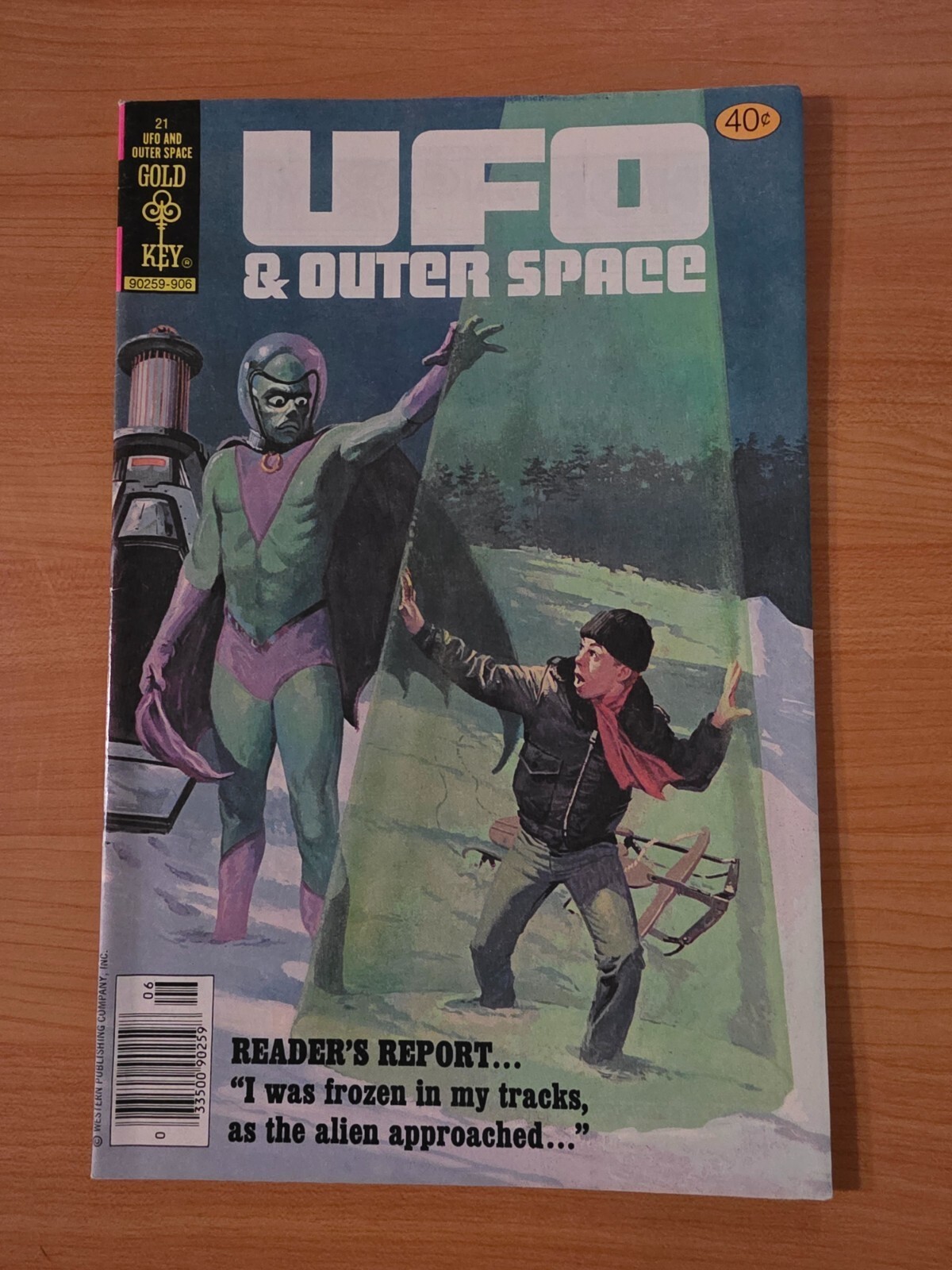 Item DescriptionUFO & Outer Space #21Publisher: Gold Key ComicsPublished: 1979Item Grade/ConditionGrade: VERY FINE - NEAR MINTFor more information about this grade and other grades, please see our grading standards.~ WE TAKE HIGH DEFINITION PICTURES OF OUR COMICS ~ For more detail use the ZOOM Function and check them out yourself! ~Shipping Info:United States: Comic Book & Magazine Orders of all sizes, big and small ship for a flat Single Shipping ChargeInternational: We use Calculated Shipping! ~ This insures that you get the LOWEST POSSIBLE COST! ~ Please give us one business day to calculate large orders! The Calculator for Hip is pretty bad for international, contact us if you are looking to order multiple books so we can help you make it work on the back end! As a courtesy to our customers, we insure all orders over 50$ US ~ YOU DONT PAY EXTRA!Delivery TimeWe process and ship all orders within 1 business days. Once shipped, estimated U.S. transit time is 2-10 business days; international 14-21 business days.(Orders placed on Friday afternoon as well as weekends will be shipped the next business day as we do not ship on the weekends).PackingOmnomax Traders has mastered packing to ensure our orders of a "damage-free transport."Using the following methods, we have seen a nearly perfect 99% success rate for undamaged comics!Here is how our orders ship:All Orders :Bagged AND Boarded, ALWAYS NO EXCEPTIONS!Shipped in a Gemini Comic Mailer OR Tightly secured between 4x stiff pieces of corrugated cardboard (double Sandwiched)Sealed on all 4 sides with strong packing tape (Items doesn't even wiggle).:*Now this method is nearly perfect! however we have seen damage happen to items ( only once or twice a year ) ~ this is often due to bad handling by the postal service. Always remember to contact us if this happens! we are committed to quality service!*Offers History