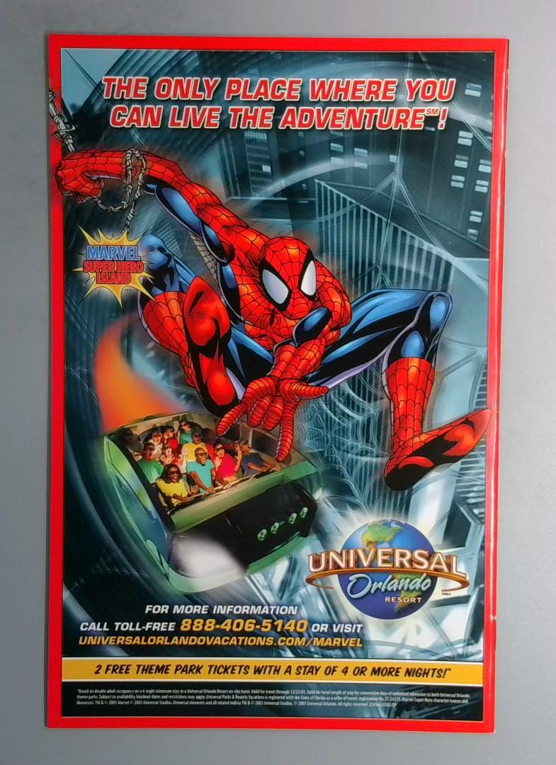 Additionally included is a Universal Orlando Resort promotional insert advertising Marvel superhero experiences at the theme park, featuring Spider-Man and offering special vacation packages with complimentary theme park tickets.